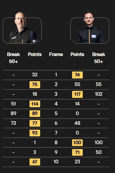 马克·威廉姆斯打出三杆50+(51、89、73),大卫·吉尔伯特打出两杆破百(102、100)和两杆50+(55、50),上半场双方战成2-2平,中场休息后马克·威廉姆斯连胜三局率先到达赛点,最终6-4战胜大卫·吉尔伯特,晋级16强。