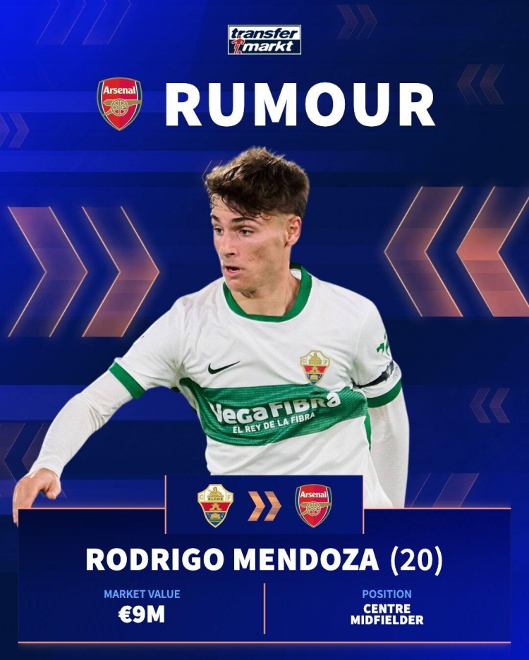 直播吧12月1日讯据罗马诺的报道,阿森纳在关注现效力于西甲埃尔切队的20岁中场球员门多萨(RodrigoMendoza)。