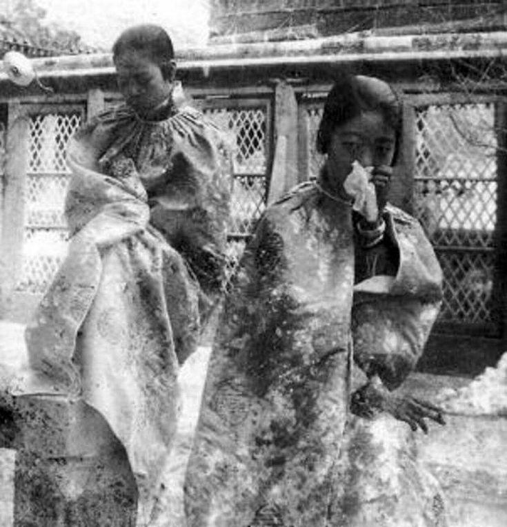 这是一张记录清末民初、逊清皇室后妃日常的老照片,画面中的两位女性正是溥仪的皇后婉容(右侧)与淑妃文绣(左侧),场景应是紫禁城内的院落一角。 左侧的文绣垂首整理着身上略显宽松的旗装,姿态内敛沉静;右侧的婉容则以手帕掩住口鼻,神态带着几分日常的慵懒或轻浅不适,动作松弛得像是宫内院落里普通的片刻休憩。