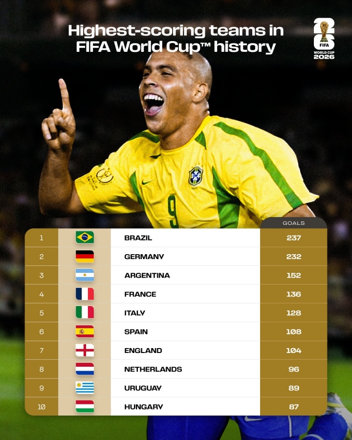 榜单上,巴西237球居首,德国232球紧随其后,巴德断档前二,阿根廷152球第3,法国136球第4,意大利128球第5,西班牙、英格兰、荷兰、乌拉圭、匈牙利前10。