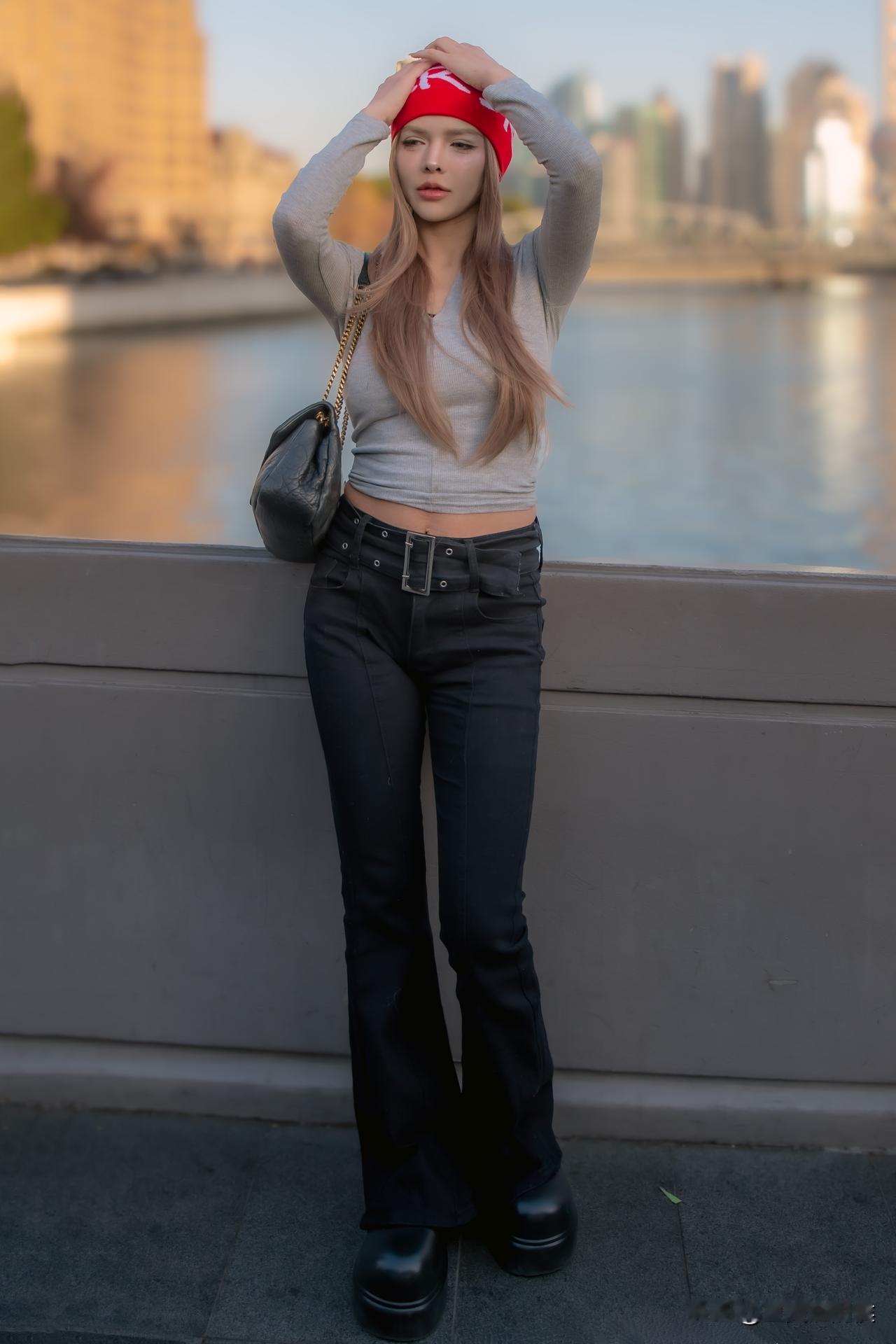 蓝色低腰打结衬衣搭牛仔裤堪称街拍女神超A穿搭密码蓝色衬衣极为百搭盛夏搭短裙