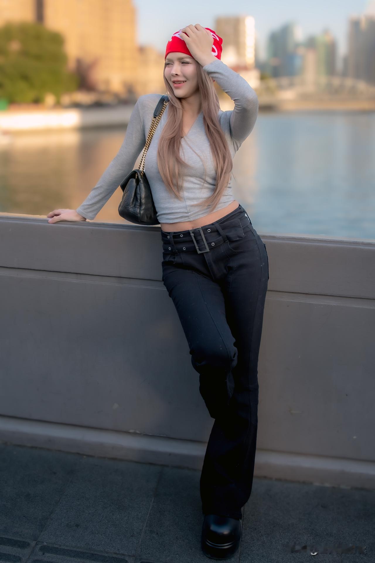 夏日清新少女,绿意盎然湖畔,白色蕾丝上衣,牛仔短裙,自然清新,甜美可人。街拍高