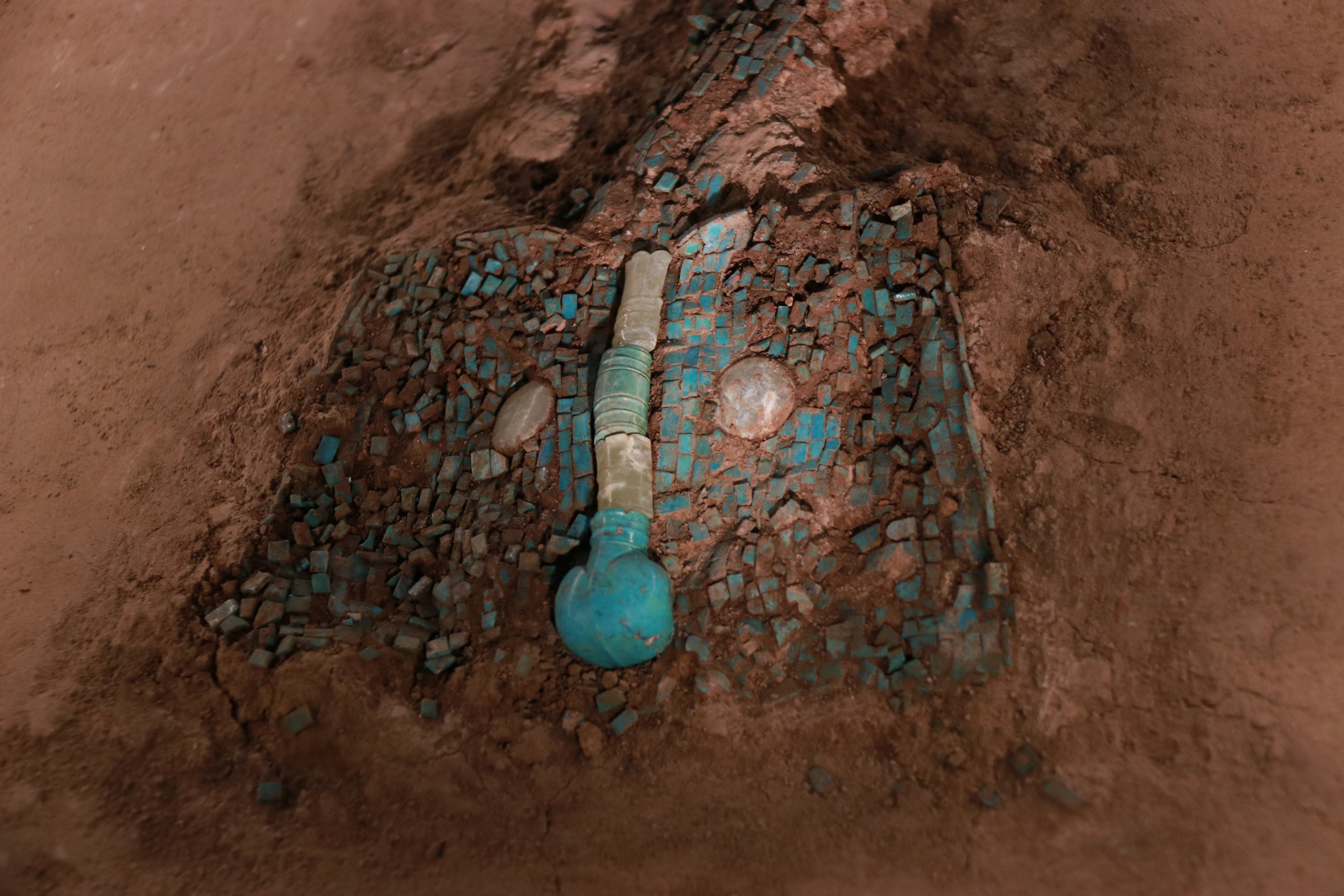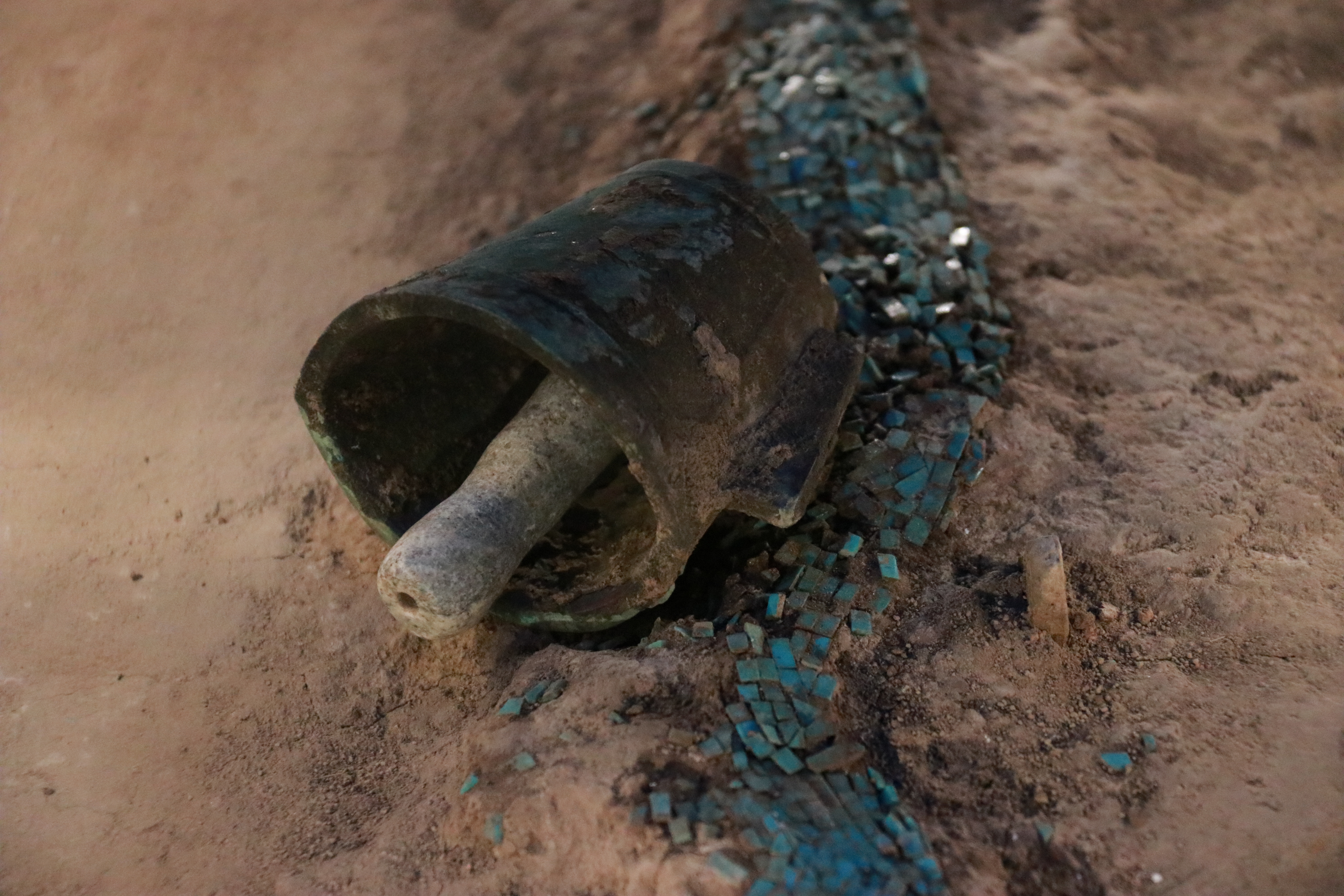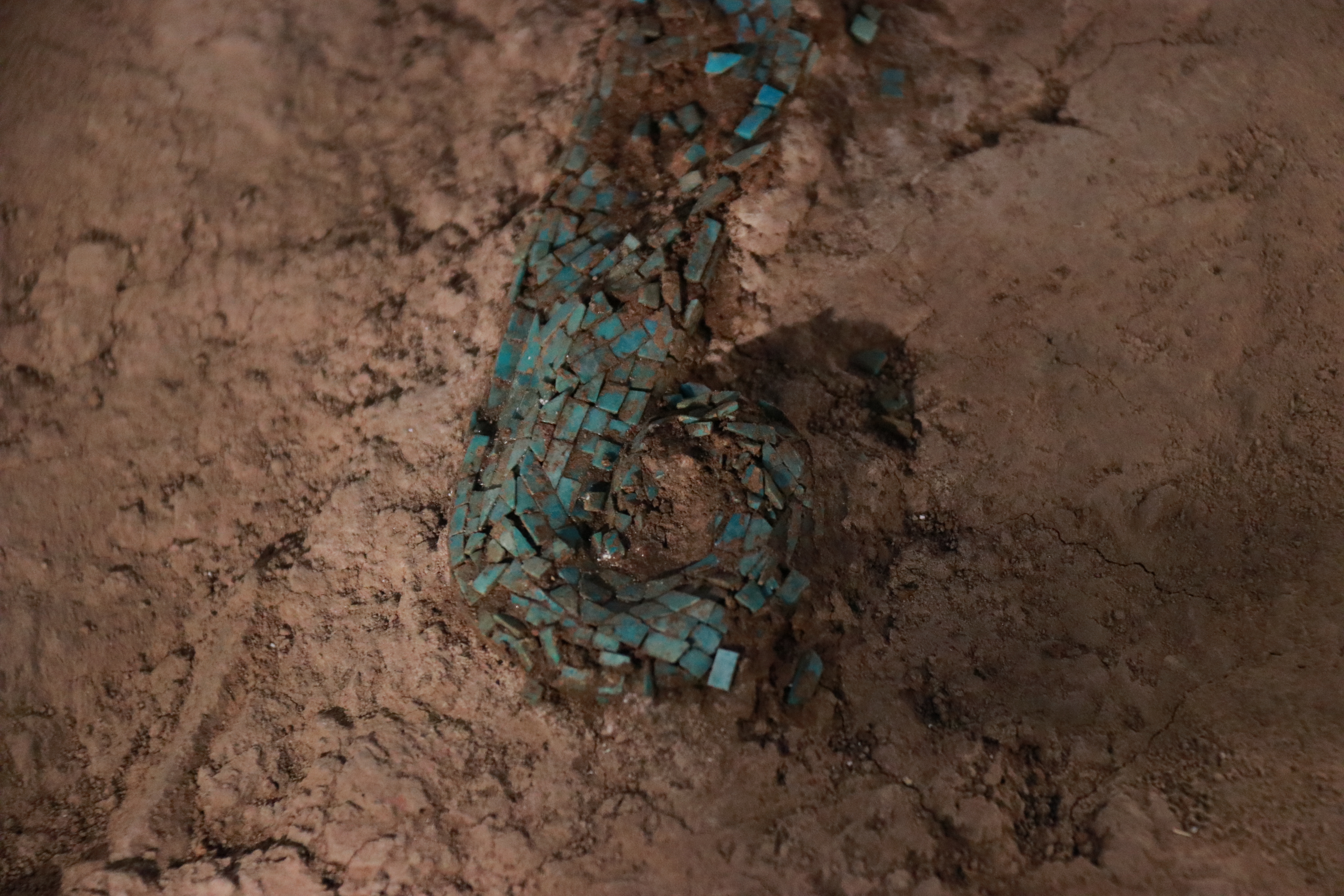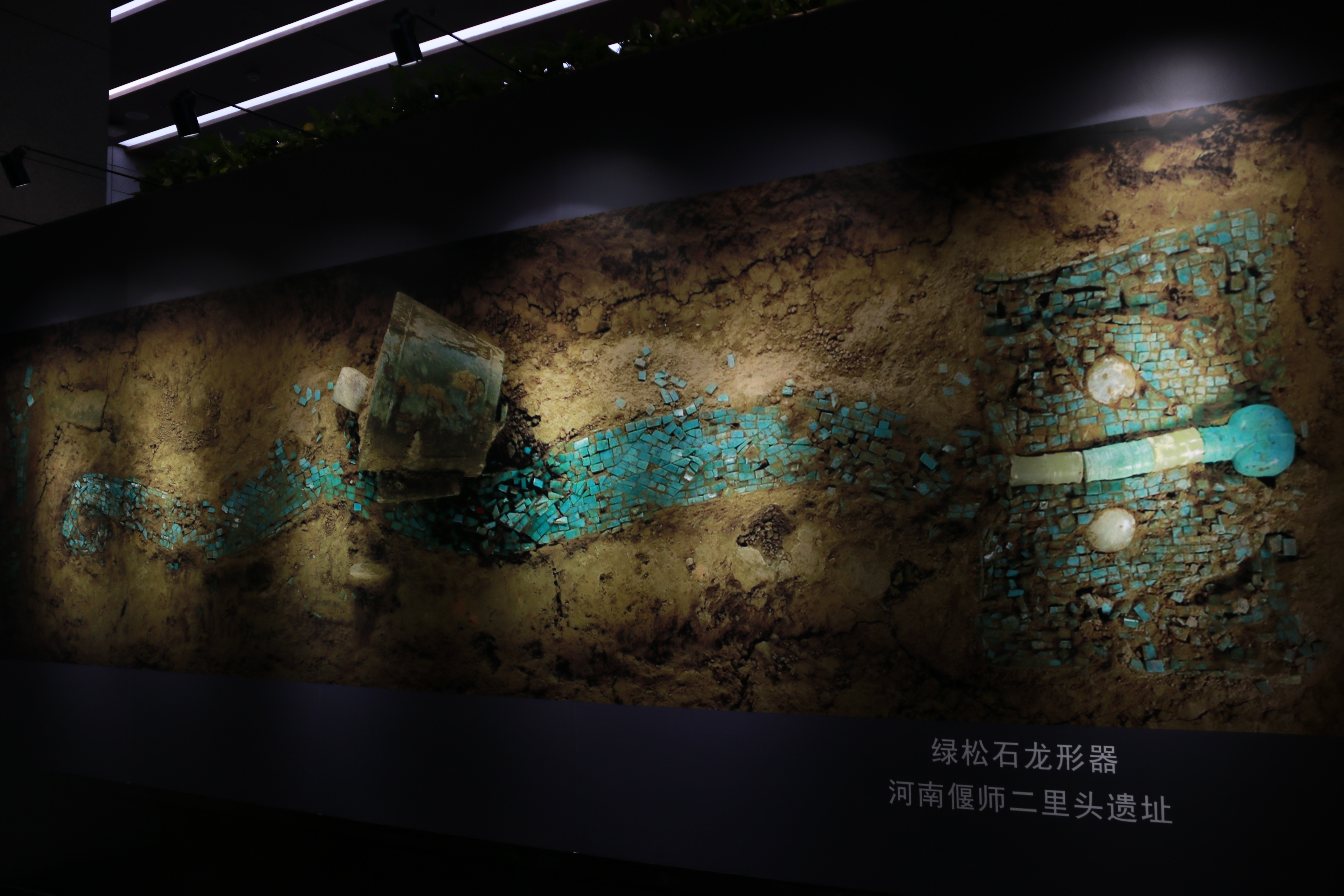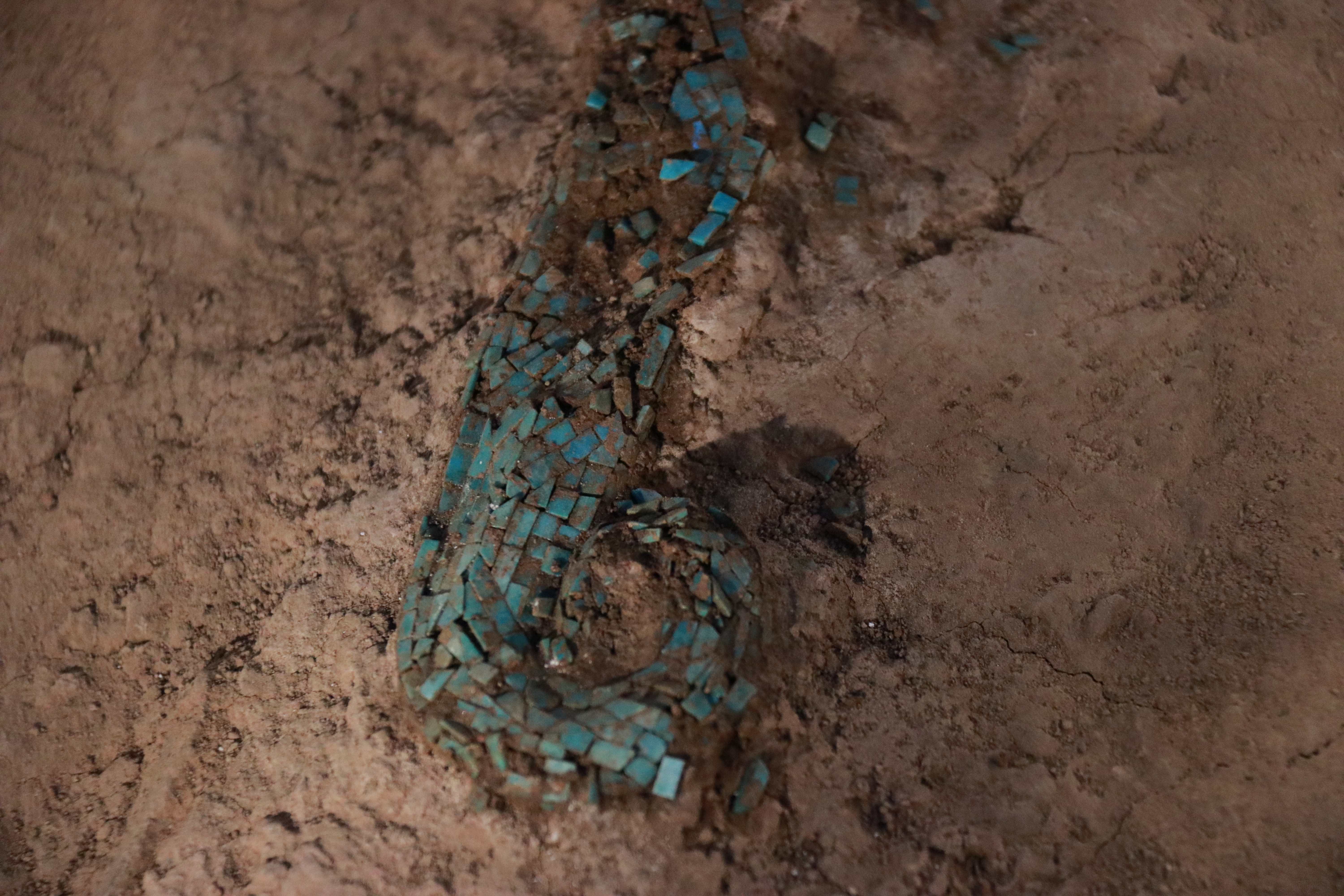 绿松石龙形器 夏 中国考古博物馆藏2002年出土于河南洛阳偃师二里头遗址VT15 M3号高等级贵族墓,绿松石龙形器出土时位于墓主人身体由肩部至髋骨处,头朝西北,尾向东南。龙身长64.5厘米,距尾部约4厘米处有一镶嵌绿松石条带与龙身垂直,整体器物超过70厘米。龙身中段有一饰有凸弦纹的铜铃,铃内有玉质铃舌。龙形器约由2000多片绿松石片组合而成,每片绿松石大小仅2-9毫米、厚度仅1毫米,由绿松石片组成的菱形主纹象征鳞纹。绿松石龙形器用工之巨、制作之精、体量之大,在中国早期龙形象文物中十分罕见。文物我的2025博物馆之旅