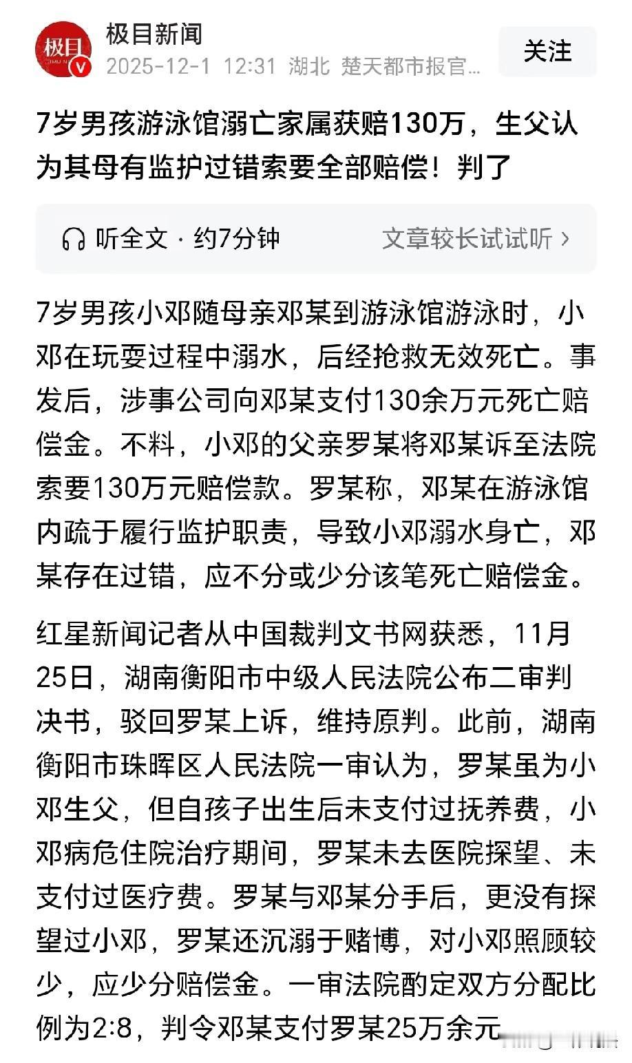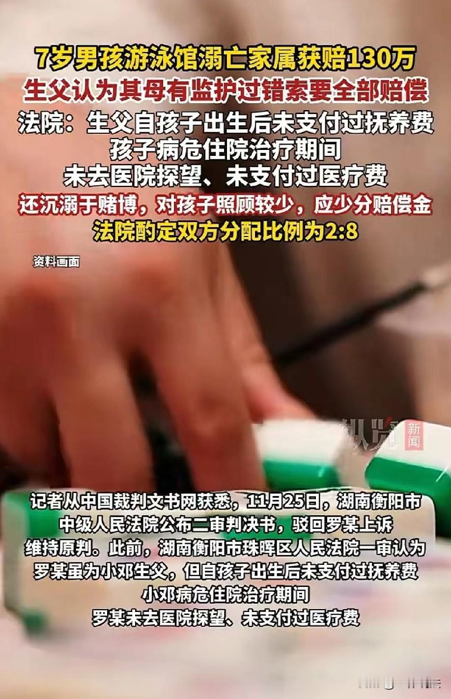 湖南衡阳,女子带7岁男孩去游泳馆游玩,不幸溺水而亡,游泳馆给女子赔偿130万后,男孩父亲眼红了,把女子告上法庭,以没有尽到监护职责为由,索要全部或者大部分赔偿金。女子不服:男子没有给过一分钱抚养费,从不关心孩子,甚至在孩子住院期间都没来看看,完全没有尽到过当父亲的义务,而且好赌成性,这钱给他肯定会打水漂。男子闹上法庭后,法院这样判。 2024年8月,30多岁的邓女士牵着7岁儿子小邓的手,走进了一家游泳馆,带他学习游泳。 看着儿子兴奋地扑向泳池,邓女士高兴的合不拢嘴,她特意趁着假期把儿子从衡阳老家接到顺德,就想好好陪陪他。 但她怎么也没想到,这趟充满期待的亲子之旅,会变成一场天人永隔的悲剧。 小邓像条小鱼在水里嬉戏,邓女士在池边不时叮嘱“慢点游”,偶尔低头回复工作消息。 可就在她转头的几分钟里,泳池里的喧闹突然消失,等她猛然抬头,只见儿子在泳池深处挣扎,水面上只露出一只小手。 邓女士疯了似的扑过去,游泳馆工作人员也赶紧赶来施救,可送到医院后,小邓还是因抢救无效离开了人世。 抱着儿子冰冷的身体,邓女士的世界彻底崩塌了。她一遍遍自责,要是自己时刻盯着儿子就好了。 处理完儿子的后事,涉事游泳馆与邓女士、小邓的生父罗某达成和解,赔偿了130万余元死亡赔偿金,这笔钱全部打到了邓女士的账户上。 邓女士和罗某是2015年在东莞打工时认识的,恋爱后没办结婚登记就生了儿子小邓。 孩子出生后,户口落在了邓家,一直跟着邓女士和外公外婆生活,吃喝拉撒全靠邓女士一家支撑。 这期间,罗某不仅没给过一分钱抚养费,就连2016年小邓病危住院、医院下了病危通知书时,他都没露面,更别提掏医疗费了。 两人恋爱期间分分合合,罗某只在同居时接小邓去过一次东莞过暑假,偶尔去邓家探望过几次。 2022年正式分手后,罗某更是彻底断了联系,连句问候都没有。 邓女士后来才从微信聊天里得知,罗某这些年沉溺赌博,输了不少钱,根本没心思管孩子。 让邓女士万万没想到的是,儿子的死亡赔偿金到账后,一直消失的罗某突然冒了出来。 他看着130多万的赔偿款,眼睛都红了,直接把邓女士告上了法庭,声称邓女士在游泳馆疏于监护,导致孩子溺亡,存在重大过错,理应不分或少分赔偿金。 邓女士知道,罗某要这笔钱就是拿去赌博,绝对不能给他。 更何况,孩子从小到大,罗某没有管过一天,抚养费没给过一分,生病也不管,分手了更不探望,现在孩子没了,他倒想来分赔偿款,这还配当个父亲吗? 为此,邓女士的父母也出具了声明,证明这些年他们一直帮着照顾小邓,这笔赔偿金理应归邓女士所有。 法院查明,罗某虽为小邓生父,但从未履行抚养义务,对孩子的成长毫无付出,而邓女士作为直接抚养人,与孩子感情深厚,孩子的离世给她造成的精神伤害远大于罗某。 《民法典》第二十六条规定:父母对未成年子女负有抚养、教育和保护的义务。成年子女对父母负有赡养、扶助和保护的义务。 罗某自小邓出生后未支付过抚养费,小邓病危时未探望、未付医疗费,分手后也未探望,且沉溺赌博,属于故意不履行抚养与保护义务。 邓某带小邓游泳时存在过失性监护疏漏,但属于无心之失,与罗某的故意不履行义务在性质上有本质区别,不能作为不分或少分赔偿金的法定事由。 《民法典》第三百零三条规定:共有人约定不得分割共有的不动产或者动产,以维持共有关系的,应当按照约定,但是共有人有重大理由需要分割的,可以请求分割。 死亡赔偿金虽非遗产,但属于死者近亲属的共同共有财产,罗某与邓女士作为小邓的父母,均为赔偿权利人,形成共同共有关系。 法院考虑到邓女士长期抚养小邓、承担主要经济与情感付出,与小邓共同生活紧密;罗某未履行义务,对小邓成长无实质贡献,故应当给邓女士适当多分。 最终,一审法院酌定按2:8的比例分配赔偿金,扣除邓某已经支付的4万余元丧葬费后,判决邓女士支付罗某25万余元。 罗某不服,觉得自己分得太少,提起了上诉。 11月25日,二审法院作出判决,驳回罗某的上诉,维持原判。 这笔钱是儿子用生命换来的,邓女士只想用这笔钱告慰儿子的在天之灵,而不是让一个不负责任的父亲拿去挥霍。