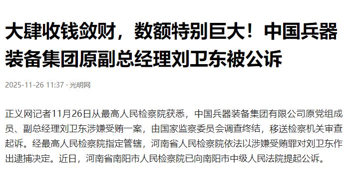又有一个“内鬼”被法办了 这次是危害国防安全的 刘卫东,原来是东方大国兵器装备集团的高管,因为收了别人巨额贿赂,已经被公诉机关正式逮捕了。   刘卫东被查办的消息,再次让军工领域的反腐话题成为舆论焦点。 本是从东风汽车基层技术员一步步走到兵器装备集团副总经理的刘卫东,本该是守护国防安全的“守门人”,却偏偏把自己活成了啃食国防利益的“内鬼”。 这位1966年出生的湖北籍高管,手里攥着每年数百亿的装备采购订单,还能接触到新型装备性能参数、列装计划这类战略级涉密信息,旁人眼里的“位高权重”,在他这儿却成了权钱交易的筹码。 刘卫东案从不是孤立的偶然事件,而是我国军工反腐体系化建设进程中一个再典型不过的缩影。 放眼全球,军工腐败都是国防领域的通病,就拿乌克兰来说,其国防采购领域曾长期被中间商把持。 2023年时中间商在军火合同中的占比高达82%,一些官员和商人勾结,把价值23万美元的无人机合同虚报8万美元成本。 甚至给前线部队提供劣质的电子战系统、无人机,靠着这种蝇营狗苟的手段瓜分利益,哪怕设立了专门的国防采购局试图改革,也难逃既得利益集团的阻挠,采购局局长甚至被威胁、人肉,改革举步维艰。 反观我国,早就跳出了“头痛医头、脚痛医脚”的被动模式,而是靠着制度和技术的双重发力,把反腐的笼子越扎越紧。 就说制度层面,如今的军工采购早就不是某个人说了算的“一言堂”。以兵器装备集团这类军工央企为例,采购环节实行“阳光采购”机制,数百亿的订单不再是某一位高管能拍板决定,而是要经过立项、竞标、审计、验收等多道关卡,供应商资质要层层审核,中标结果要公开公示,哪怕是刘卫东这样的分管高管,也没法绕开制度流程给关系户开绿灯。 关键是我国对军工领域的反腐从不是“一阵风”,而是常态化、体系化的布局,中央纪委国家监委对军工央企的巡视实现全覆盖,干部轮岗、离任审计、重大事项报备等制度环环相扣,像刘卫东这种“靠企吃企”的行为,不管是收受贿赂还是泄露涉密信息,只要触碰红线,必然会被揪出来。 别以为躲在幕后搞暗箱操作就能瞒天过海,现在的大数据监管系统,能把每一笔采购资金的流向、每一件装备的采购价格都扒得明明白白。 比如采购一批装备,系统会自动比对市场均价、同类型装备采购价格,哪怕是小数点后几位的差价,都能精准识别;区块链技术则给涉密信息和采购流程上了“锁”,谁看过、谁改了、谁审批了,全程留痕,想删都删不掉。 对比乌克兰那种“作坊式”的武器生产模式给腐败留的漏洞,我国的军工体系靠着技术赋能,把权力关进了数据的“笼子”里,别说收巨额贿赂,就算是想占点小便宜,系统都会立刻预警,纪检监察机关能第一时间掌握线索。 从数据来看,党的十八大以来,军工系统的反腐力度持续加码,仅2023至2025年,就有数十名军工央企中高层管理人员因违纪违法被查处,其中涉及采购环节的占比超过六成,像刘卫东这样手握采购大权的高管,更是重点监管对象。 这些案例不是为了制造恐慌,而是清晰地传递出一个信号:军工领域绝不是腐败的“法外之地”。 过去有人觉得,军工采购涉及保密,监管难免有盲区,可现在的监管手段早就跟上了,涉密信息分级管理,接触人员全程备案,哪怕是能接触到新型装备参数的核心人员,其行为也在多重监督之下。 说到底,刘卫东案的查处,不是我国军工反腐的终点,反而是体系化建设成效的一次集中展现。 当制度的笼子越扎越紧,当大数据、区块链这些技术手段全面覆盖,那些还想在军工领域伸手的人,无非是重走刘卫东的老路——以为权力能换利益,以为隐蔽就能逃脱,最终只会发现,自己的每一次伸手,都逃不过监管的眼睛。 国防安全容不得半点私心,军工领域的每一分钱都要用在刀刃上,这不仅是制度的要求,更是技术的必然,刘卫东的下场,就是所有试图触碰军工反腐红线者的最终结局。 对此你有什么看法,来评论区聊聊。