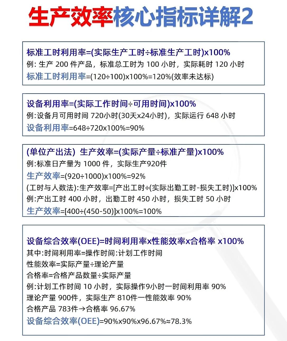 生产制造企业生产效率核心指标详解生产线效率 产业效率 1:人均产量=生产总量/参与生产的员工人数 例:某车间月生产手机10000台,参与生产的员工50人 人均产量=10000÷50=200台/人 2:产出工时=产出数量 x 标准工时 例:生产500个零件,每个零件的标准工时(理论耗时)为0.6小时 产出工时=500x0.6=300小时 3:产量目标达成率=(实际产量÷计划产量)x100% 例:计划月产8000台,实际生产7600 达成率=(7600÷8000)x100%=95% 4:产能利用率=(实际产量÷设计产能)x100% 例:设备设计产能为每天120件,实际日产量108件 产能利用率=(108÷120)x100%=90% 5:标准工时利用率=实际生产工时÷标准生产工时x100% 例:生产200件产品,标准总工时为100小时,实际耗时120小时标准工时利用率=(120÷100)x100%=120%(效率未达标) 6:设备利用率=(实际工作时间÷可用时间)x100% 例:设备月可用时间720小时(30天x24小时),实际运行648小时 设备利用率=648÷720x100%=90%