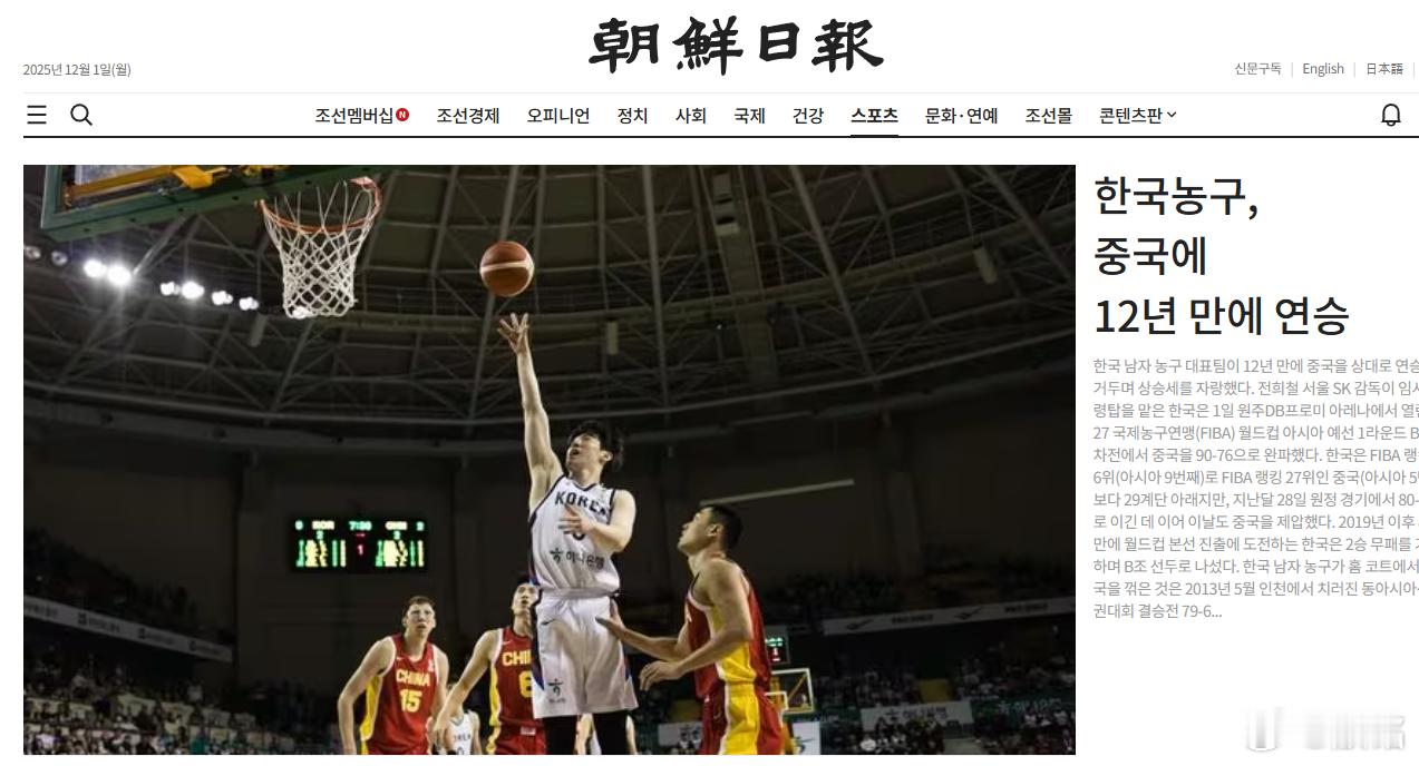 中国男篮对阵韩国两连败 韩国《朝鲜日报》的报道相对平静,也没过分吹嘘,只是强调