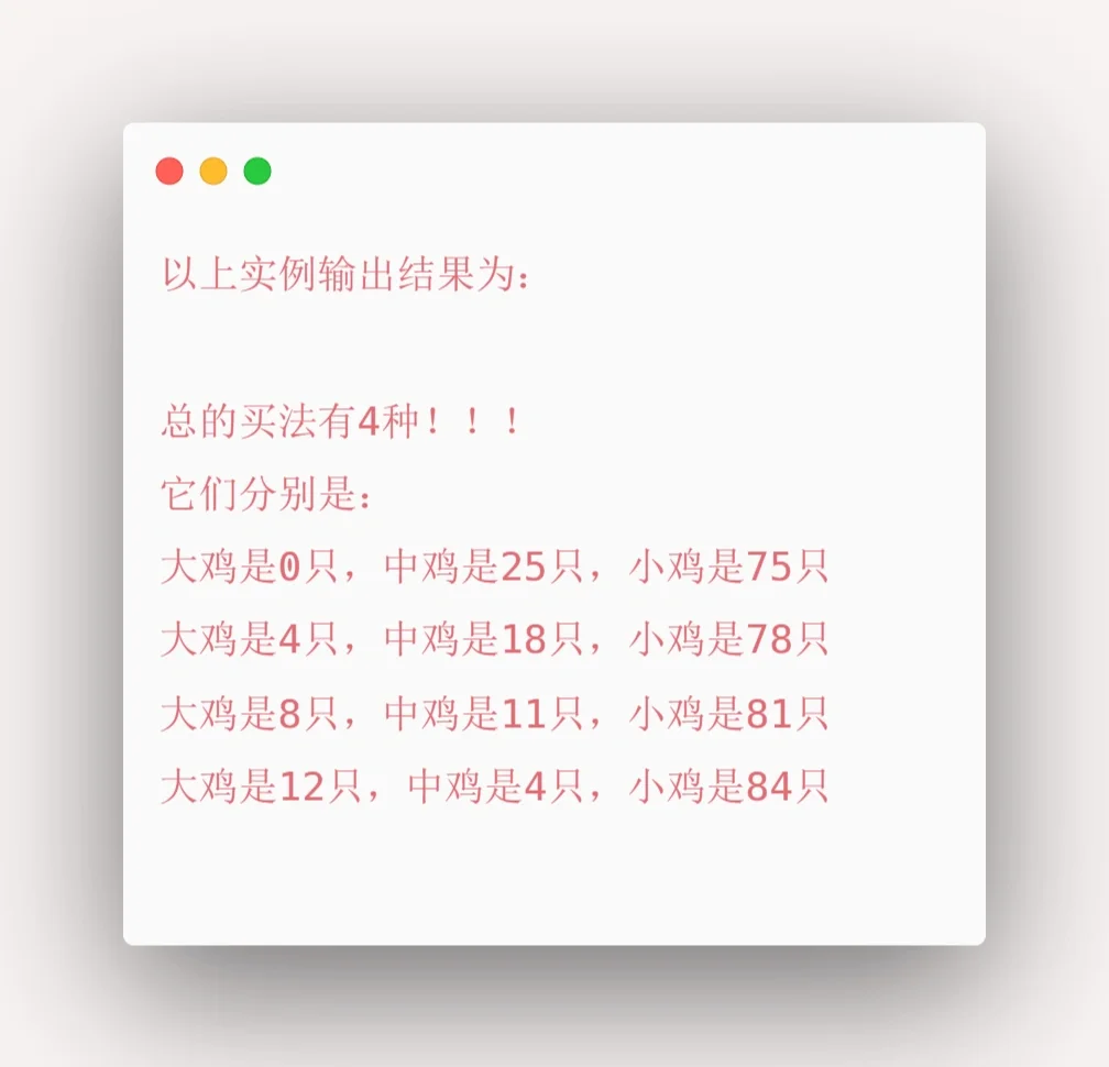 Python小项目[零R][二R] ~ [一R]要求: 假设大鸡5元一只,中鸡3元一只,小鸡1元三只,现在有一百元钱想买一百只鸡,有多少种买法? ~