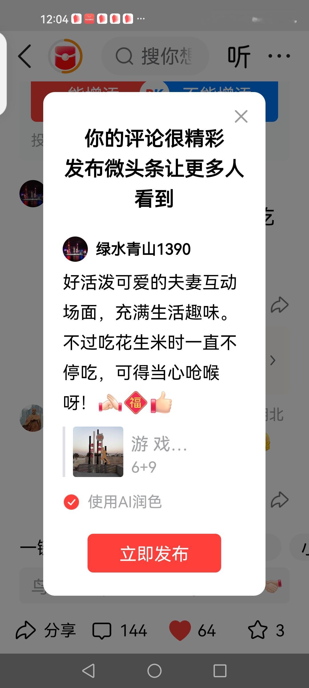 好活泼可爱的夫妻互动场面,充满生活趣味。不过吃花生米时一直不停吃,可得当心呛喉呀![作揖][福][赞]