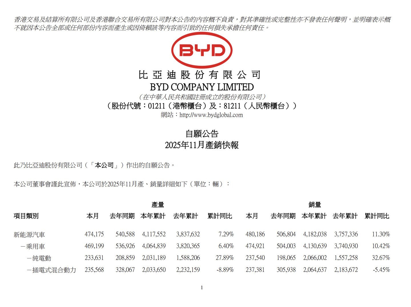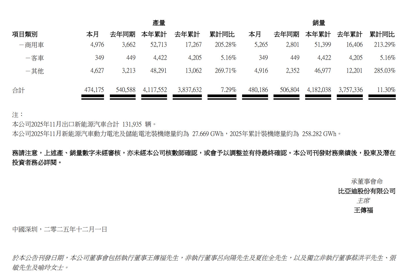 【比亚迪 11 月新能源汽车销量 48.02 万辆续创年内新高,今年累计销量 418 万辆比亚迪公告:11 月汽车销量 480186 辆,去年同期 506804 辆。今年 1-11 月,汽车销量 418 万辆,同比增长 11.3%。公司 2025 年 11 月新能源汽车动力电池及储能电池装机总量约为 27.669GWh,2025 年累计装机总量约为 258.282GWh。从数据中获悉,比亚迪当月乘用车销量 474921 辆,其中包含纯电动汽车 237540 辆、插电式混动汽车 237381 辆。比亚迪集团品牌及公关处总经理李云飞表示,11 月销量再度创下年内新高;海外销售突破 13 万辆,同样创下历史新高。
