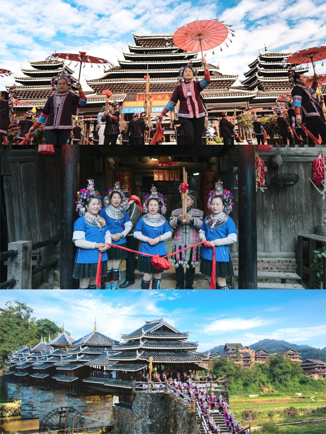 D1️⃣:程阳八寨 ➡️逛永济桥、鼓楼群、非遗工坊 ➡️ 晚餐百家宴 ➡️ 夜观《坐妹》演出 ➡️住侗寨民宿