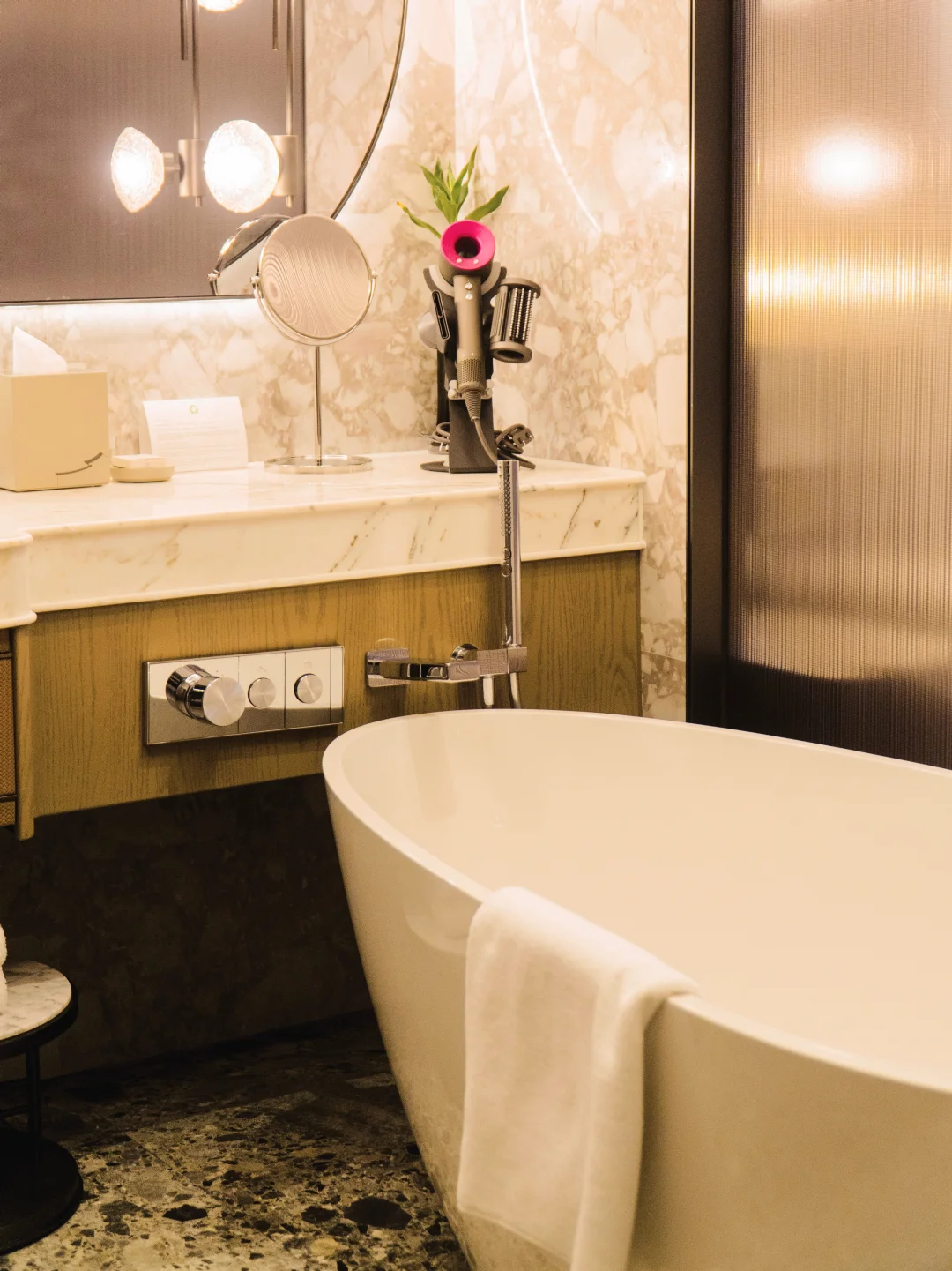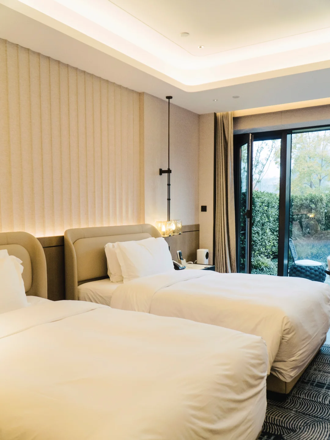 戴森吹风机,JBL 音响,斯林百兰床垫,BYREDO 洗浴用品,Nespresso 咖啡机一应俱全,双床房也不会让人觉得住的是标间,因为两张床看起来挺宽的,而且床体设计超优雅,推开落地窗外面就是小庭院,别提有多让人留恋了!!