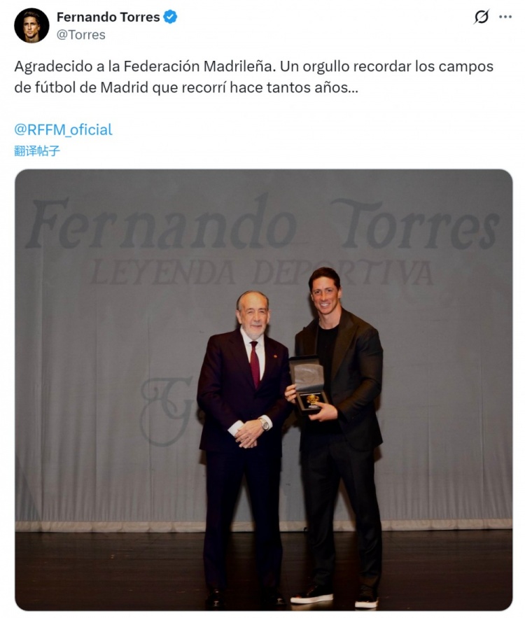 获得体育传奇奖,托雷斯社媒:感谢马德里足协,追忆过往倍感自豪