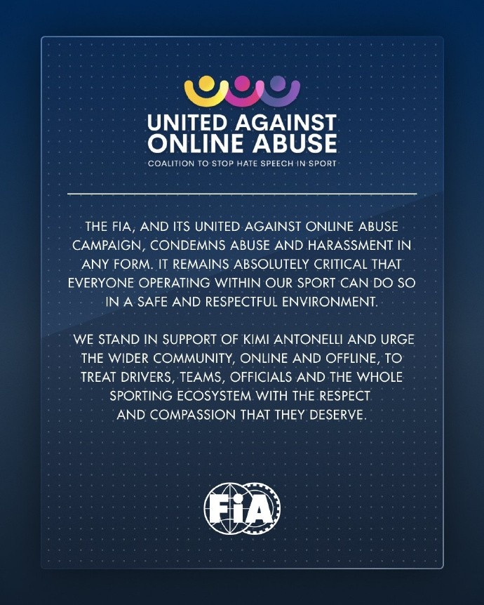 我们支持基米·安东内利,并呼吁更广泛的群体,无论在线上或线下,以车手、车队、官员以及整个体育生态系统应得的尊重和同情心去对待他们。