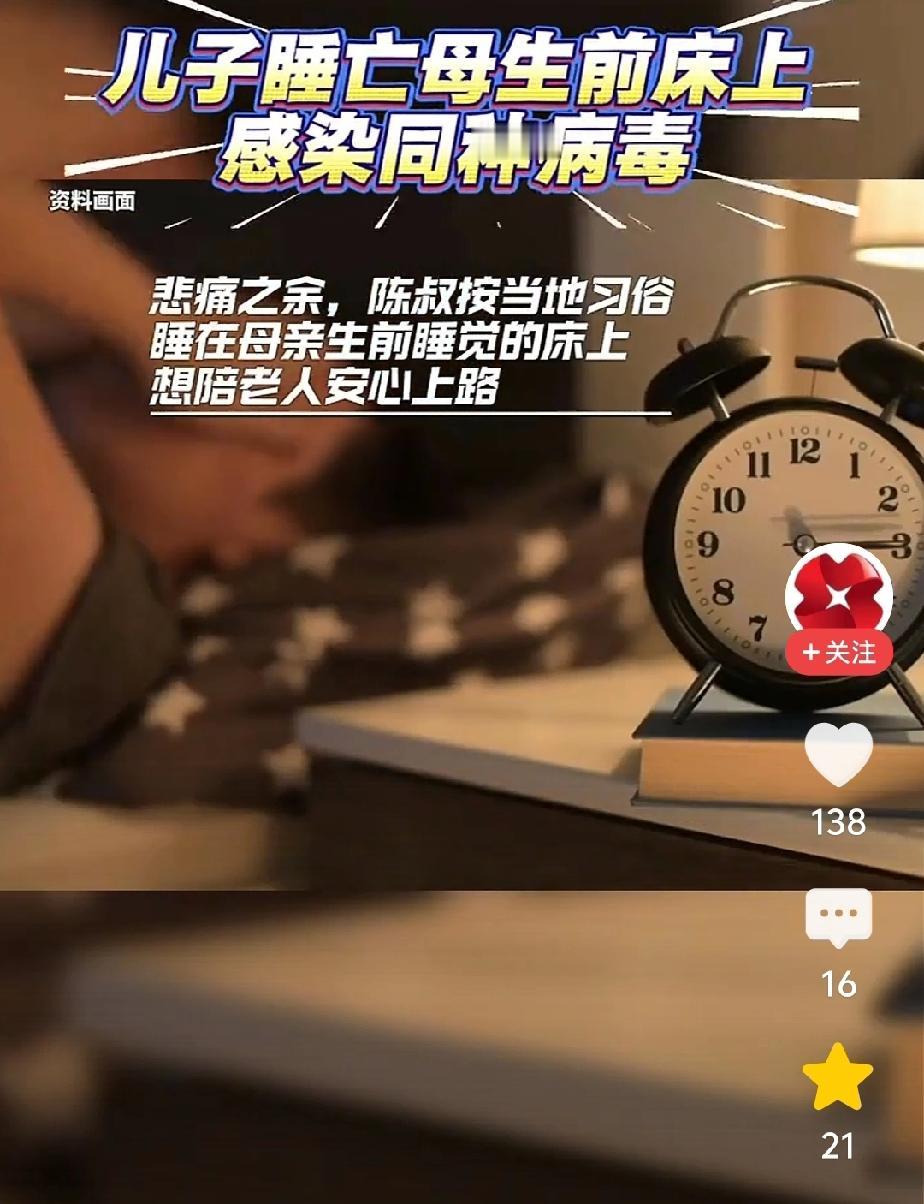 原来,人死后,儿女会扔掉你所盖过的被褥,穿过的衣服,使用过的器具,并不是嫌弃,它是有一定的科学道理的。 最近,浙江陈叔依据当地的风俗,在自己已逝母亲的床上睡觉,不料却感染了与母亲相同的疾病,幸亏就医及时,才没有酿成大祸。 陈叔86岁的母亲,本来身体健朗,没有什么疾病。但却在不久前,突然患病,上吐下泻,全身乏力,没几天就去世了。 老人去世后,儿子悲痛万分,按照当地的习俗,作为孝子要好好陪伴老人安心上路。 于是,陈叔就睡在母亲生前睡过的床上。不料,没多久,陈叔也开始腹泻,全身乏力,症状与母亲生前一样。陈叔及时就医,后来检查出来,是感染了一种与蜱虫有关的病毒--新型布尼亚病毒。 此病毒可以通过破损皮肤和黏膜进行传染。陈叔母亲生前就是感染了这种病毒,老人发病急,走的快,根本没有查出来得病的原因。 陈叔在不知情的情况下,接触了母亲生前睡过的被褥。于是,也感染了相同的病毒。幸亏就医及时,挽救了他的生命。 以前,人们总说,人活着,什么都是好的,这也舍不得用,那也舍不得扔。人死后,发完丧的第二天,你穿过的、睡过的、用过的东西,都会被子女给扔掉。看起来,好像是后人无情,翻篇太快。心中很是谴责。 原来,不是这么回事。因为人去世,不会无缘无故,总是有原因的。有的是因为意外事故,有的是因为生病,医治无效而死亡。如果因病死亡,就有可能在其生存环境中留有病菌和病毒,如果后辈子女不处理好环境,会给活着的子女带来灾难的。 人生就是一个过程,因缘际会,该来时则来,该去则去,缘生缘灭,都合于道。作为芸芸众生,看开,放下, 不执着,生时高高兴兴地生,去时痛快地去,就是最好的活法。无需过于在乎世俗的看法。 图片来自网络,侵删致歉。