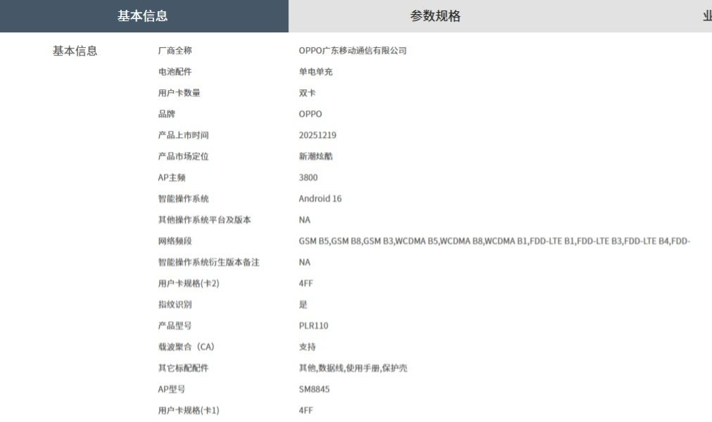 【一加 Ace 6T 手机现身中国电信终端产品库:骁龙 8 Gen5 处理器 + 8300mAh 电池】一加 Ace 6T 手机已现身中国电信终端产品库,提供 12GB+256GB、12GB+512GB、16GB+256GB、16GB+512GB、16GB+1TB 五种存储规格,拥有电光紫、闪速黑、掠影绿三种配色,产品零售价格尚未公布。相关页面显示,一加 Ace 6T 手机拥有相同的家族化设计语言,配备 6.83 英寸居中单挖孔屏、直角边框,机身底部有扬声器开孔 / 卡槽 / USB-C 接口。系列机型前置 1600 万像素镜头、后置 5000 万像素 +800 万像素镜头组合。一加 Ace 6T 的 AP 型号为 SM8845(骁龙 8 Gen5 处理器),尺寸为 163.41×77.04×8.32mm、重约 215g,配备 USB Type-C 接口(USB 传输效率为 USB 2.0HS),屏幕分辨率为 2800x1272 FHD+,内置 8300mAh 电池。