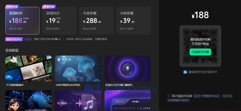 产品采用付费模式,试用次数耗尽后需付费继续使用。B站UP主可享受折扣,连续包年价格为188元,付费用户支持高清无水印导出、素材库使用、口播音频上传、音色克隆和一站式剪辑等功能。