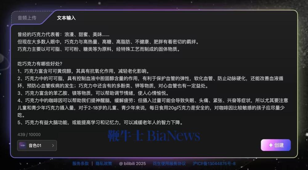 在视频生成方面,花生提供了两种生成方式:一是基于文本内容本身,智能匹配素材的视频生成;二是基于音频内容,匹配字幕与音频模板的播客形式。用户可在最终导出前对视频封面、字幕、音色、素材等进行进一步编辑,也可以将视频导出至“必剪”进行二次剪辑。