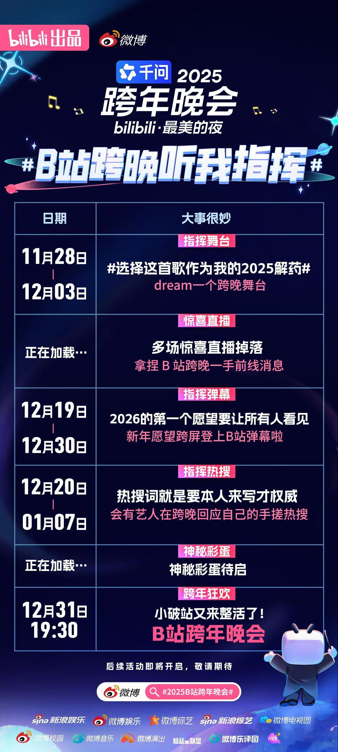 B站跨晚听我指挥 注意啦!注意啦!超多重磅惊喜正在持续解锁~你想在2025B站跨年晚会 看到哪首歌曲的精美舞台?新的一年你有什么愿望? 想让嘉宾们哪个手搓热搜词闪耀跨年夜?还有更多惊喜直播掉落!快来参与活动留下你的期待!一起去解锁快乐!还有更多彩蛋一起和B站相约跨晚! 2025最美的夜跨年晚会