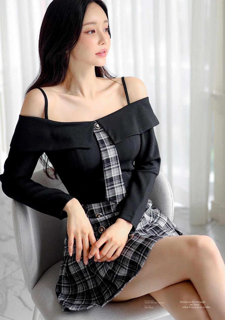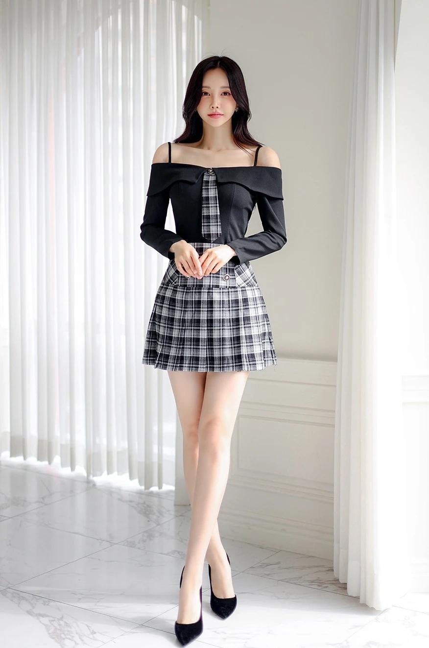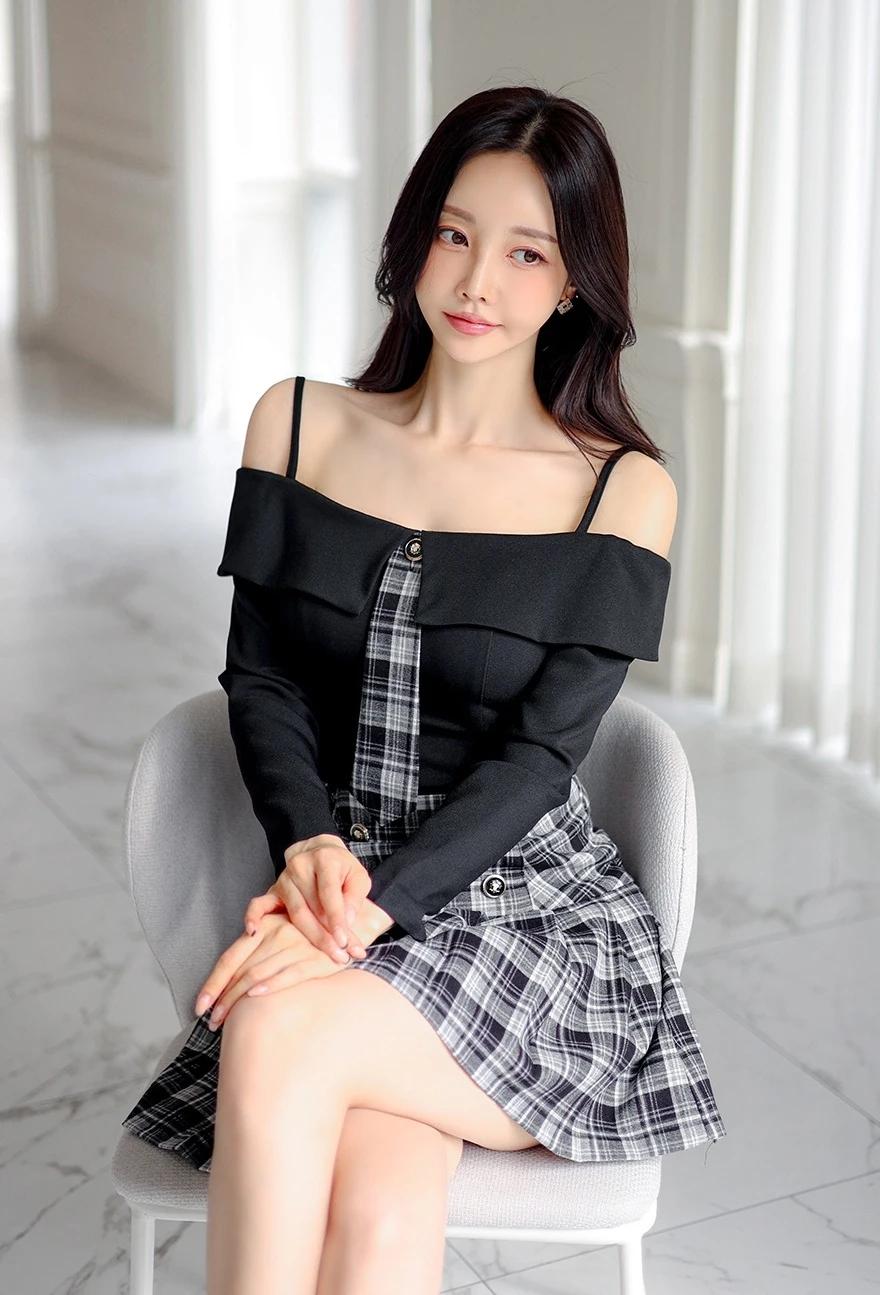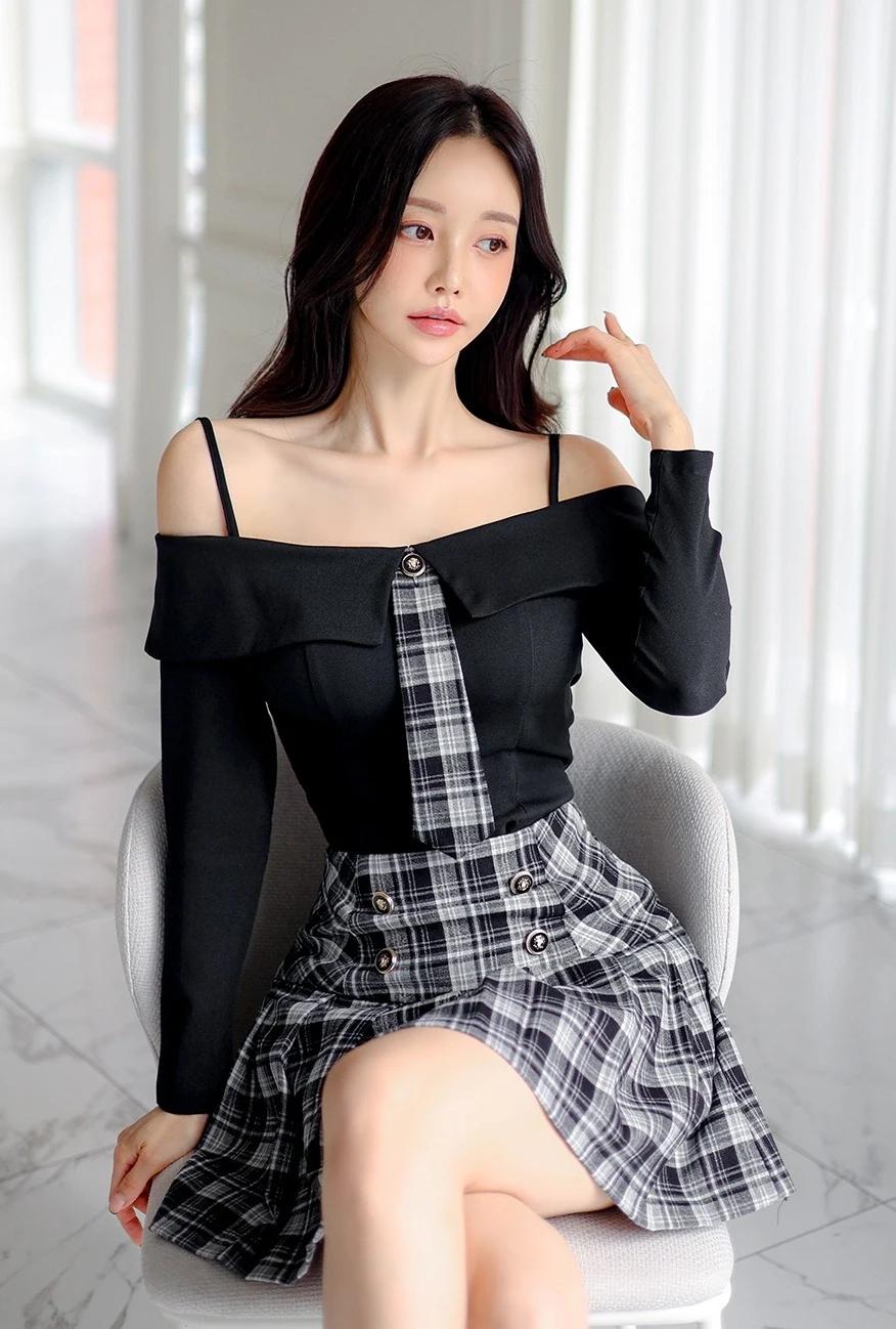 孙允珠的穿搭真的太会玩了!就说那套露肩上衣配格纹短裙,黑色露肩上衣的一字肩设计,直接把优美肩颈线条秀出来,性感又时尚,谁看了不迷糊。黑白格纹短裙侧边皮革拼接,层次感一下就丰富起来。再配上黑色绑带高跟鞋,精致度直接拉满,在简约舒适的室内,妥妥的时尚焦点。 还有那套灰色格纹套装,泡泡袖和短裤碰撞出轻复古的感觉。黑丝裹着纤细双腿,踩着酒红短靴走在砖石街道,慵懒又迷人。VALET PARKING 标牌下,手袋轻摇,绿植和橱窗都成了时尚背景,每一步都像是优雅诗篇。 #生活随手拍# 甜美小仙女的穿搭 穿搭如何自带高级感?