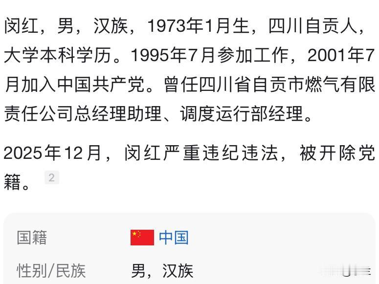 今天四川自贡燃气公司的闵红又上了热搜 他是1973年出生的四川自贡人 他长期在燃气行业深耕 曾在自贡燃气公司任过重要岗位 在燃气行业有着30年的丰富工作经验 今年52岁的他 本应是经验丰富大干事业的年纪 可惜他今天却上了热搜 这也说明了 只要做了不该做的事 都要付出代价的!