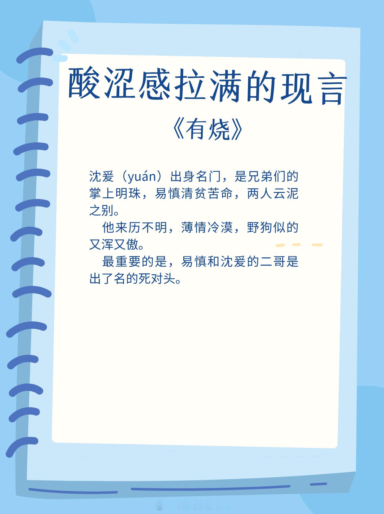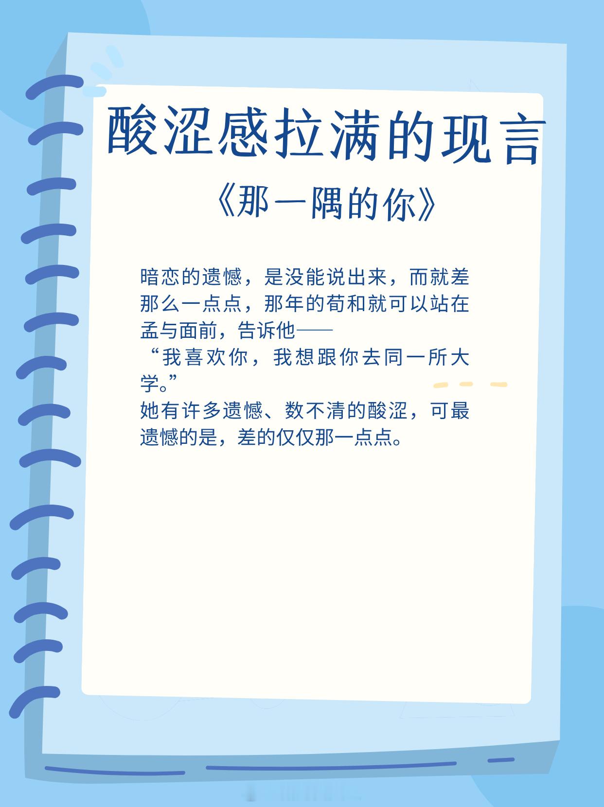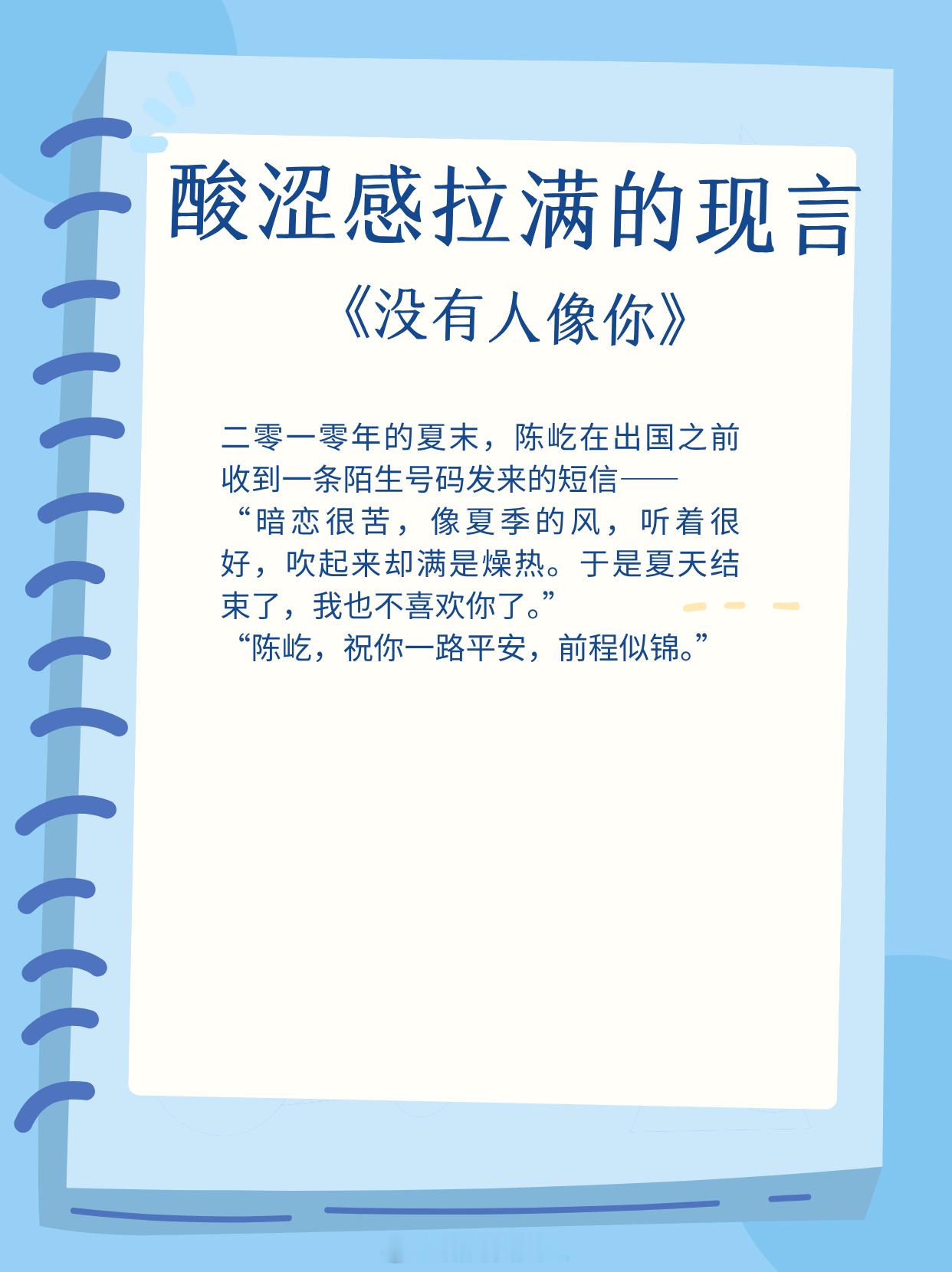 酸涩感拉满的现言,你高高在上,我匍匐于地。1、《小船三年又三年》作者:二八杠2、《没有人像你》作者:岁见3、《退烧》作者:舒虞4、《坠落》作者:甜醋鱼5、《温柔有九分》作者:唧唧的猫6、《有烧》作者:醇白7、《六十二年冬》作者:多梨8、《镜中色》作者:时玖远9、《那一隅的你》作者:见羡越读越上头的小说神作 这小说硬控我十分钟