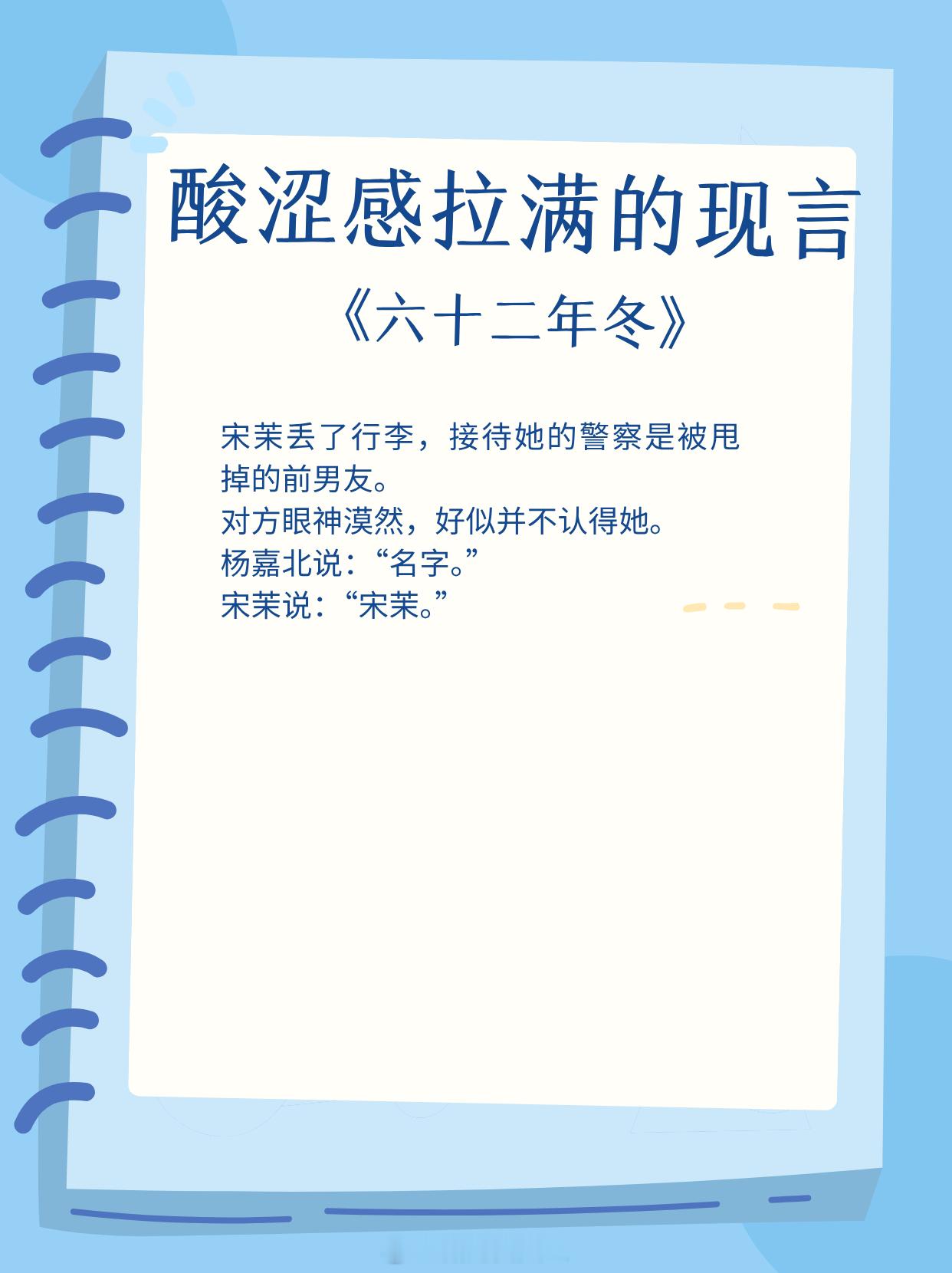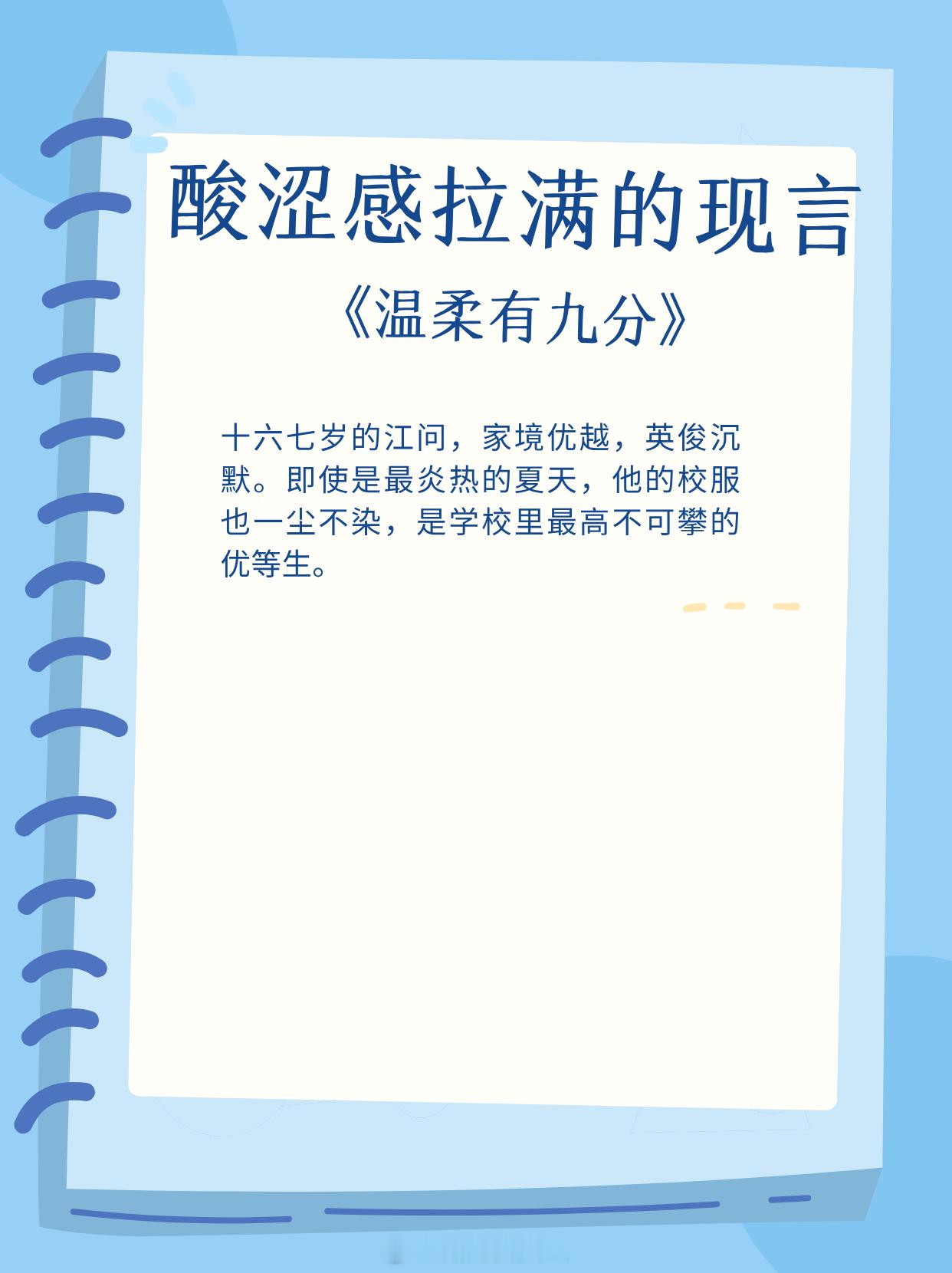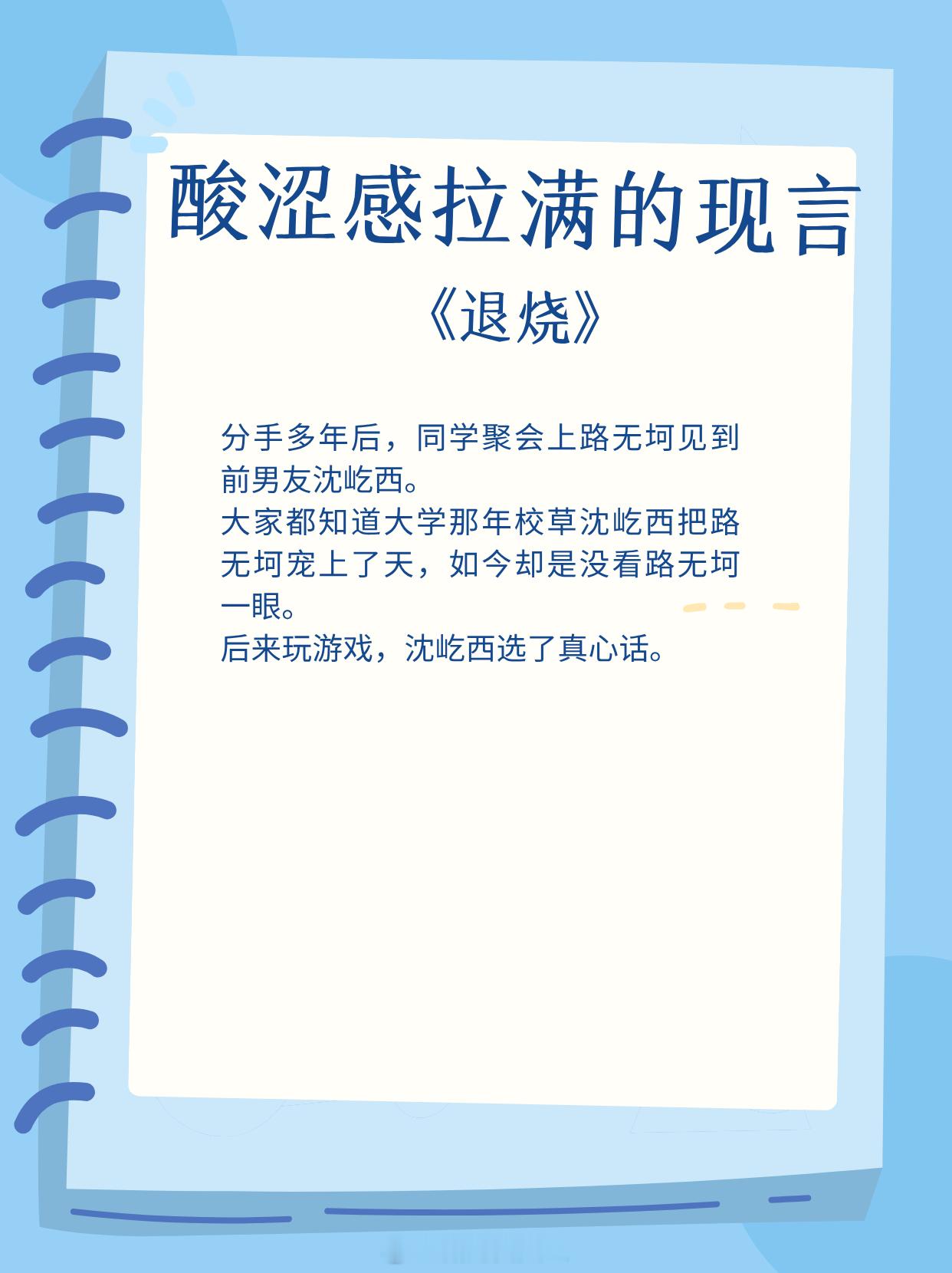 酸涩感拉满的现言,你高高在上,我匍匐于地。1、《小船三年又三年》作者:二八杠2、《没有人像你》作者:岁见3、《退烧》作者:舒虞4、《坠落》作者:甜醋鱼5、《温柔有九分》作者:唧唧的猫6、《有烧》作者:醇白7、《六十二年冬》作者:多梨8、《镜中色》作者:时玖远9、《那一隅的你》作者:见羡越读越上头的小说神作 这小说硬控我十分钟