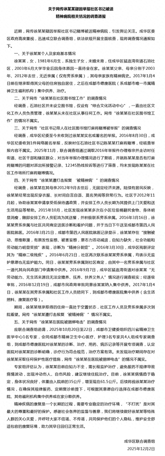 近期,网传徐某某疑因举报社区书记赌博被送精神病院,引发舆论关注。成华区委区政府高度重视,迅速成立联合调查组,依法依规开展全面核查,现将调查情况通报如下。