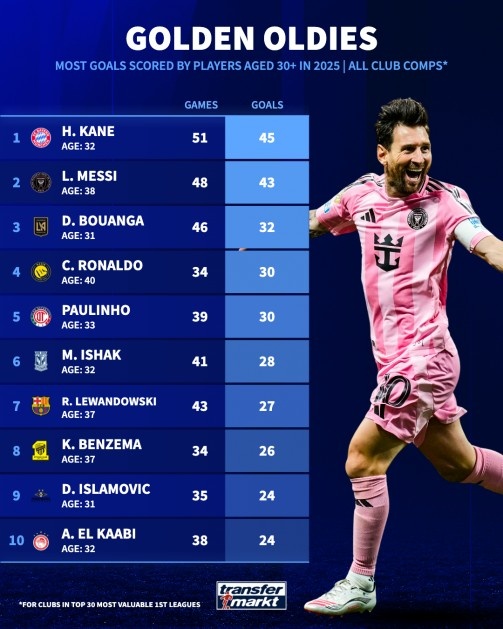 直播吧12月3日讯在世界足坛,有一些球员在进入30岁之后依然保持着良好的状态,这其中包括了凯恩、莱万等人,更不要说梅西及C罗这样的常青树球员。德国转会市场盘点了2025年足坛30岁以上球员俱乐部进球榜,凯恩以45球居首,梅西43球位居次席,C罗30球第4。