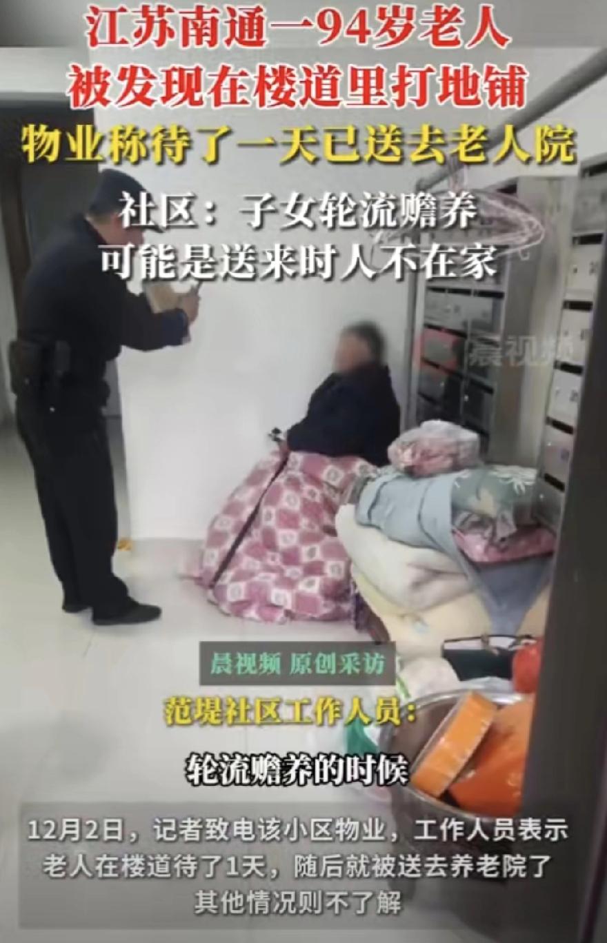 94岁老太太,寒冬腊月在楼道打地铺。看了真心酸。 视频里老人就蜷在楼道地面铺的被褥上,旁边零散堆着行李。说是子女轮流养,这次轮到哪家,送过来时没人接,就直接放楼道了。 物业说老人在楼道待了一天,后来送去养老院了。社区解释:“可能是子女不在家。”可网友一句话戳破窗户纸:“送下一家前不打电话?人不在就扔门口?” 都说养儿防老,可这5个子女,没一个把妈安顿妥当。有网友说得好:“不是钱的问题,是想不想做的事。”身边也有多子女家庭把老人照顾得很妥帖的,关键还是心在不在。 现在老人送养老院了,但这事让人忍不住想:我们老了会怎样?养孩子图啥?轮流赡养本是好意,但若只剩形式,少了温度,比不养还伤人心。 希望每个老人都能被温柔以待,毕竟谁都有走不动的那天。