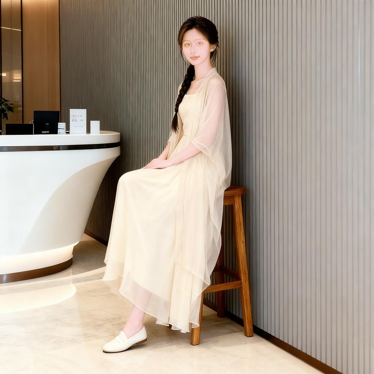 怎样穿搭能显示出温柔的女生气质? 米杏色飘逸长裙,清净优雅清纯气质。