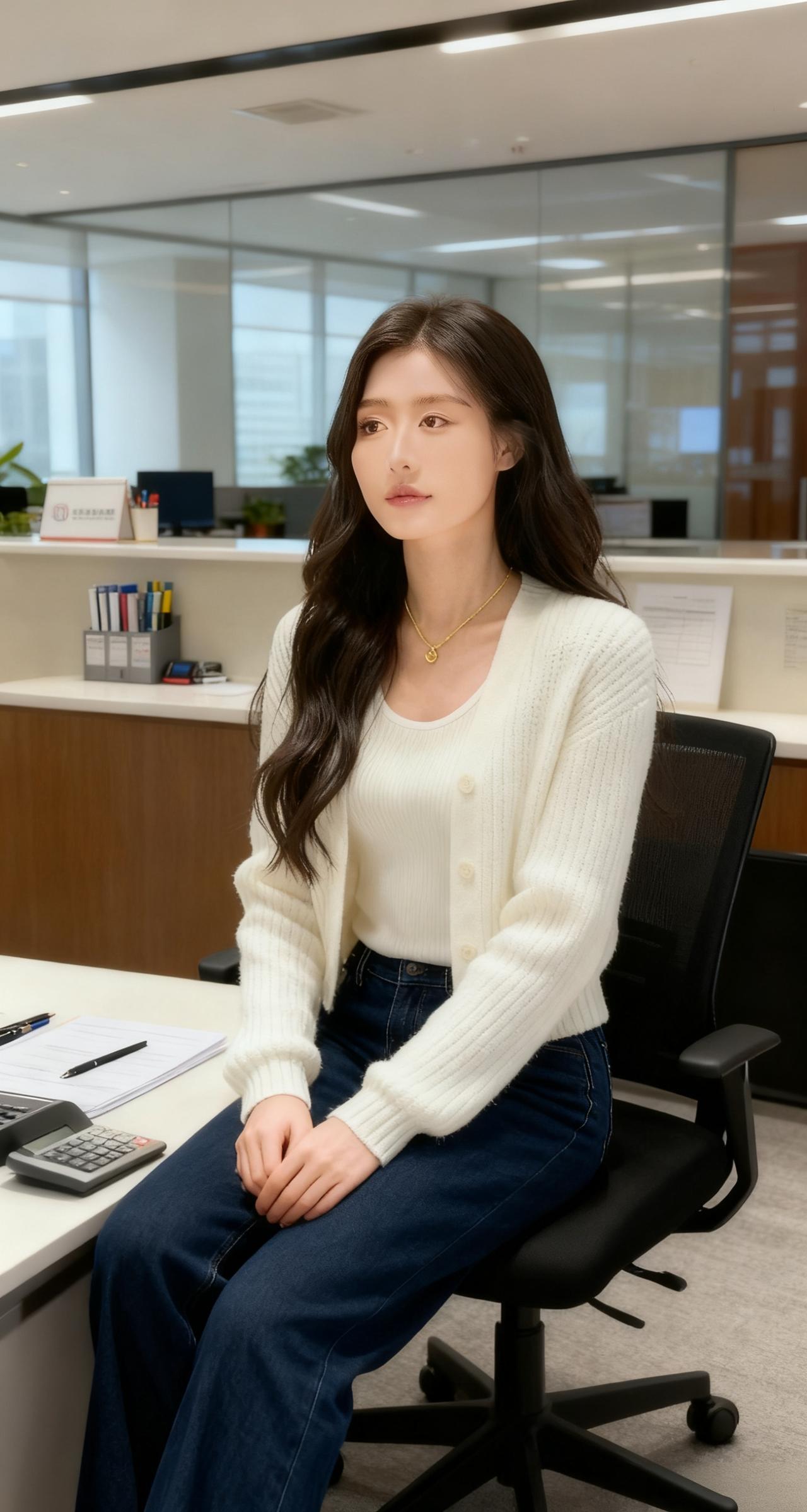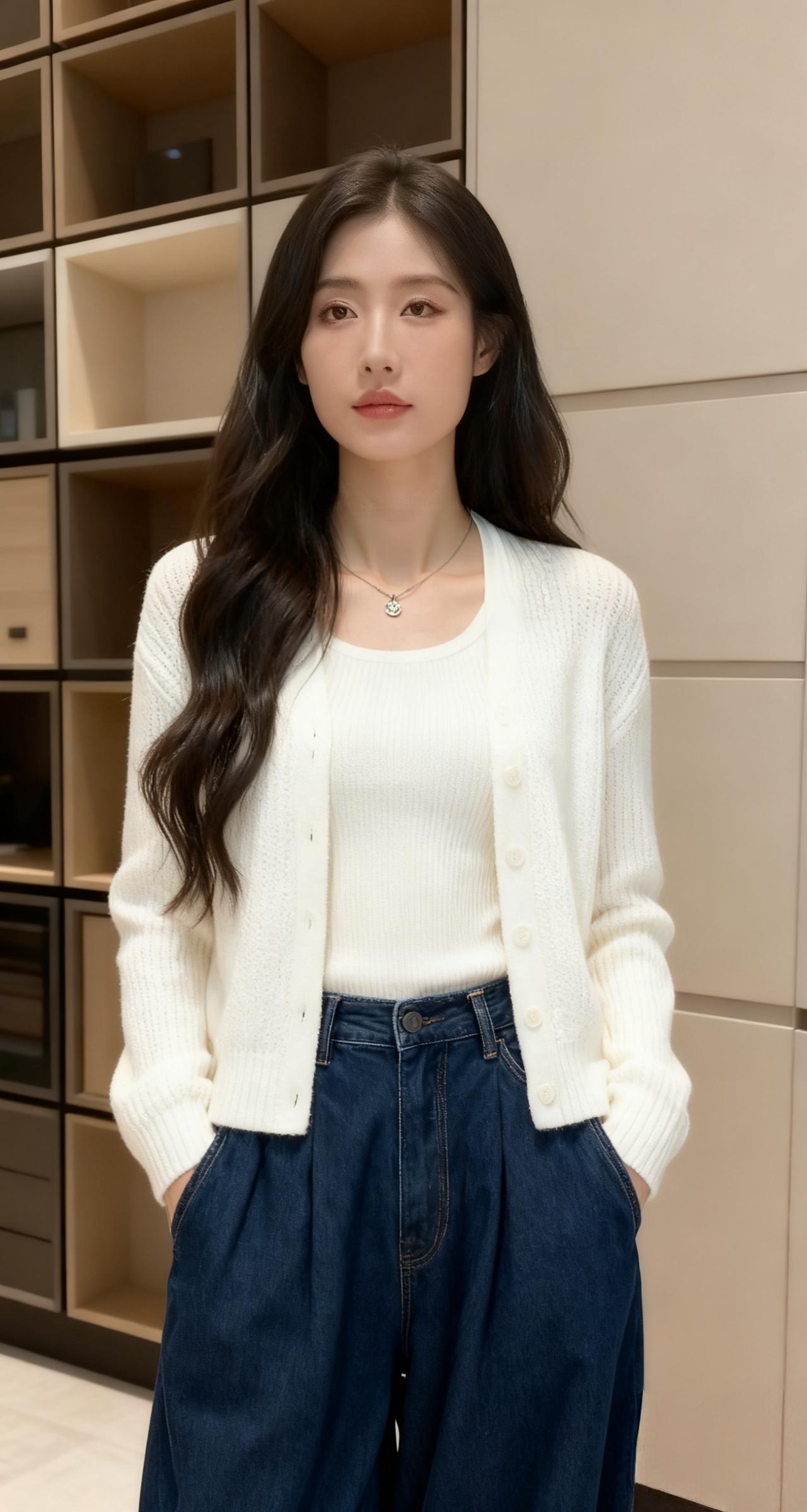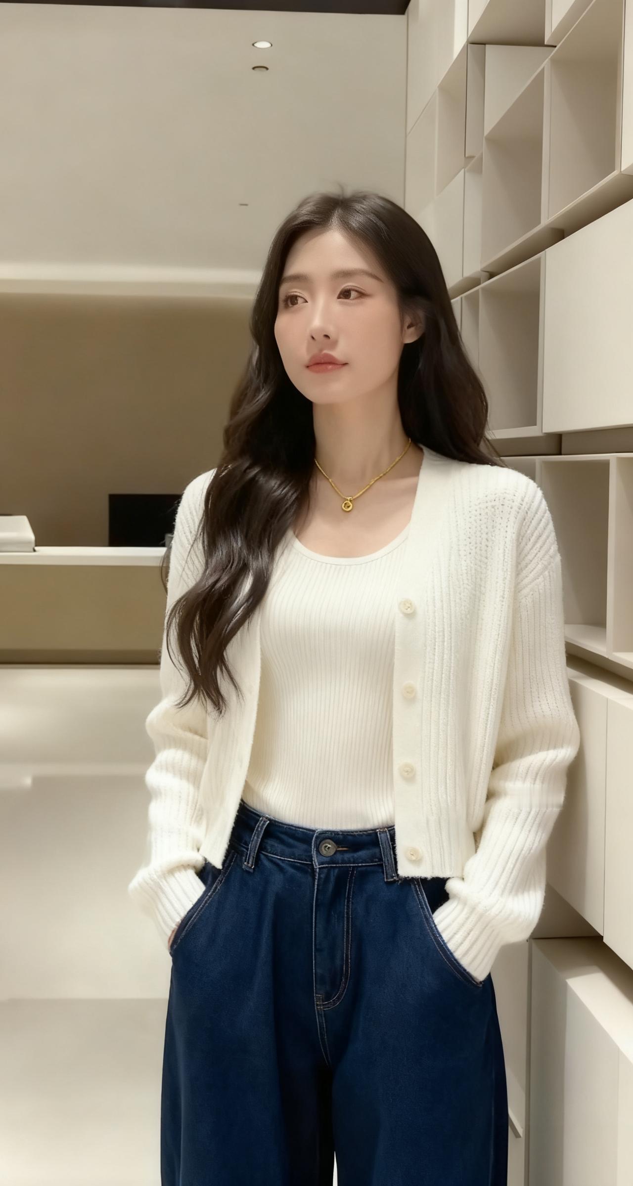 白色的针织开衫,搭配同色系的修身内搭,简约的穿搭添了点精致细节。 搭配了一条深蓝色的牛仔裤,宽松的版型和上衣的柔软感形成对比,既日常好穿,又能平衡整体的轻熟氛围。