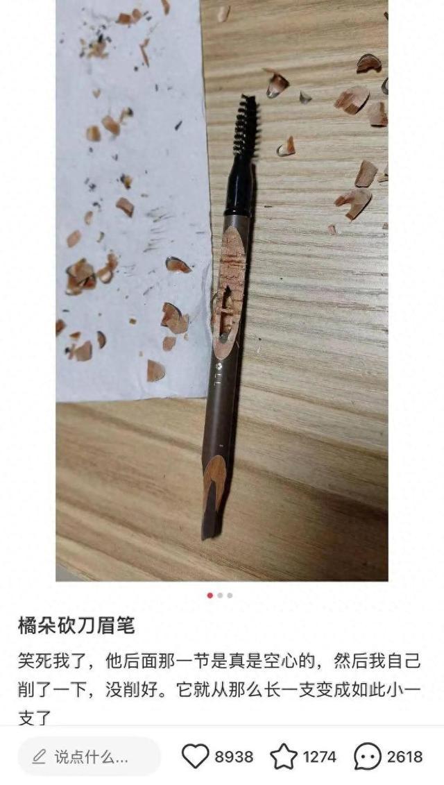 “削开眉笔,发现中间居然是空心的?”近日,一则“橘朵眉笔一半是空的”话题在社交平台引发网友热议。据了解,有网友发帖称,自己无意间将橘朵“砍刀眉笔”削开后,发现笔身后半部分竟是空心设计。