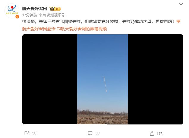 12月3日,据航天爱好者网官微发布,朱雀三号首飞回收失败,但依然要充分鼓励!失败乃成功之母,再接再厉!