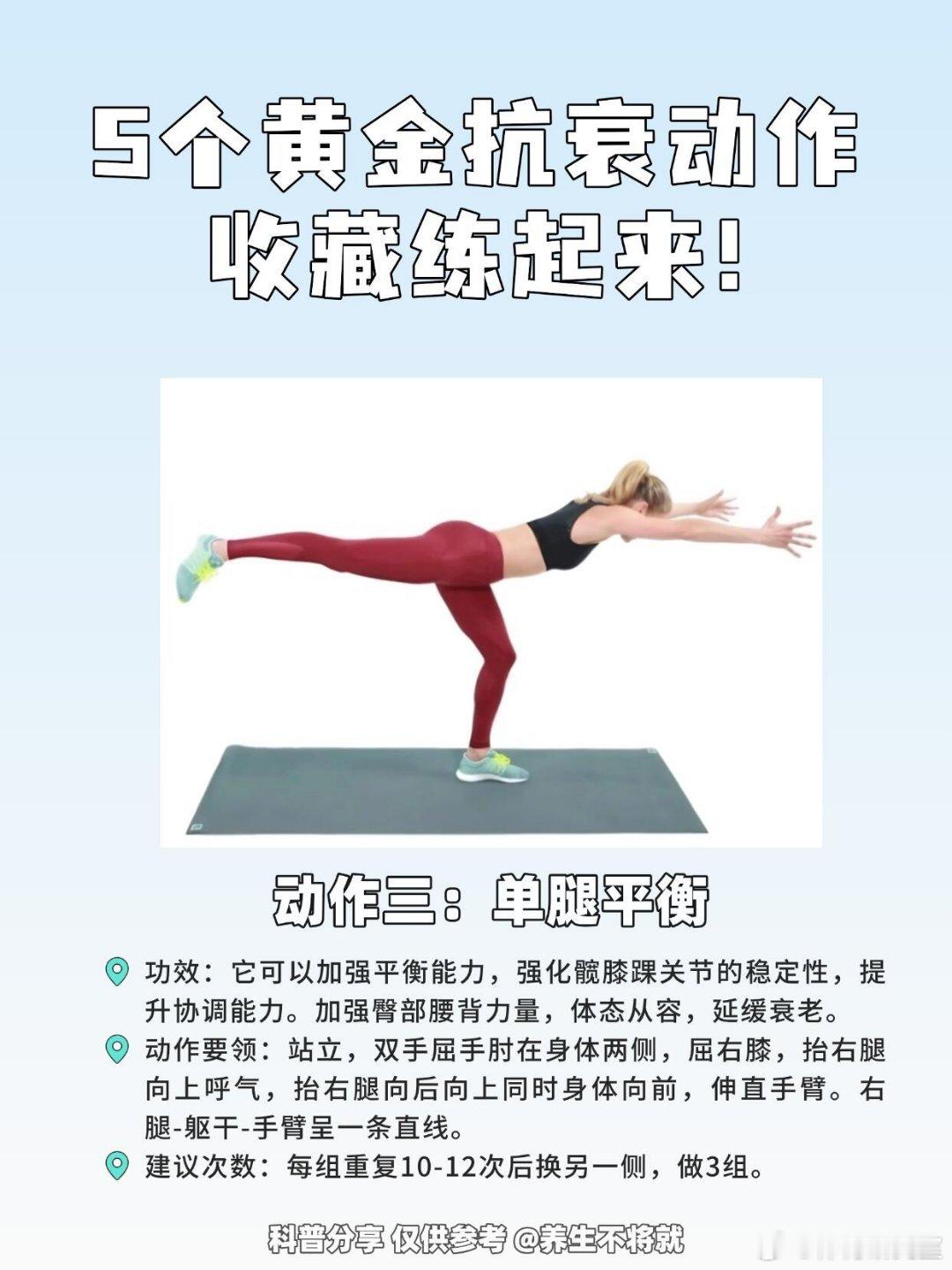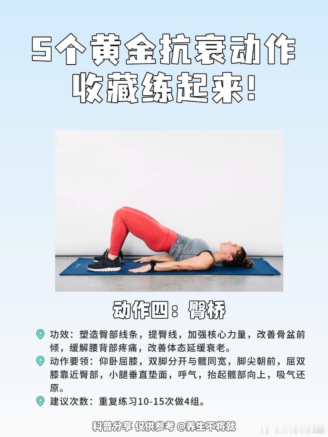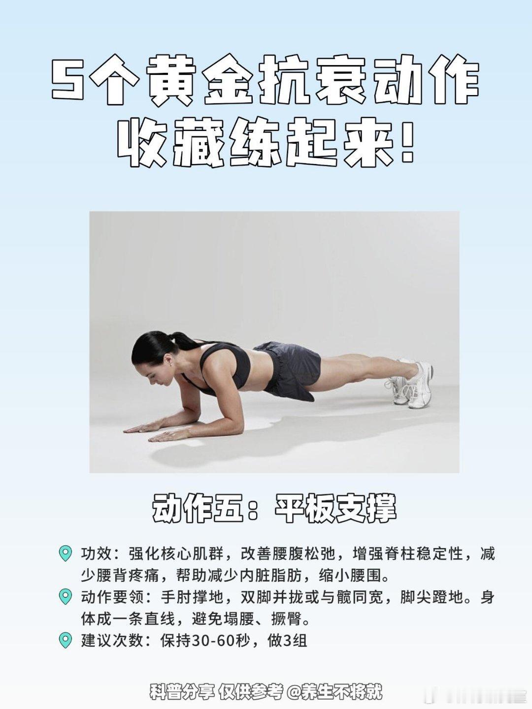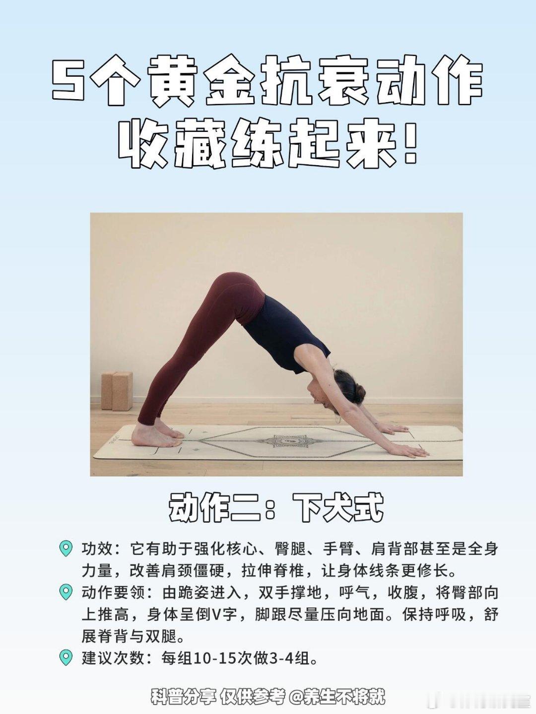全球公认5个有效抗衰老动作有人说,衰老是必然的历程,但我们总希望能走得慢一点,再慢一点。其实,抗衰老不一定要花大钱,也不一定要进健身房。抗衰的尽头不是没有皱纹,而是“维持肌肉”--轮廓清晰、皮肤紧致。有些动作,每天花几分钟,就能悄悄帮你留住时光。为什么运动能抗衰老?随着年纪增长,身体的代谢会变慢,肌肉逐渐流失,关节也开始僵硬。适当的活动,能促进血液循环,维持肌肉力量,让身体保持柔软与稳定。更重要的是,运动还能帮助我们调节情绪,释放压力——而压力,正是加速衰老的隐形推手。今天给大家分享一组全球公认的,最简单有效的5个抗衰老动作,防止肌肉的流失,调节神经系统,舒缓情绪,由内而外的预防衰老,可随时随地进行练习。一、深蹲深蹲能够锻炼到大腿、臀部以及核心肌群,强化下半身的肌肉力量,帮助维持身体的平衡与稳定。二、下犬式它有助于强化核心、臀腿、手臂、肩背部甚至是全身力量,改善肩颈僵硬,拉伸脊椎,让身体线条更修长。三、单腿平衡它可以加强平衡能力,强化髋膝踝关节的稳定性,提升协调能力。加强臀部腰背力量,体态从容,延缓衰老。四、臀桥塑造臀部线条,提臀线,加强核心力量,改善骨盆前倾,缓解腰背部疼痛,改善体态延缓衰老。五、平板支撑强化核心肌群,改善腰腹松弛,增强脊柱稳定性,减少腰背疼痛,帮助减少内脏脂肪,缩小腰围。真正的抗衰不是永葆青春,而是尽量放缓身体年龄、保持活跃的身体功能和健康的心理状态。每天不用太久,选3-4个动作,每个做一两组,就能感受到变化。动起来,其实年龄真的只是个数字。