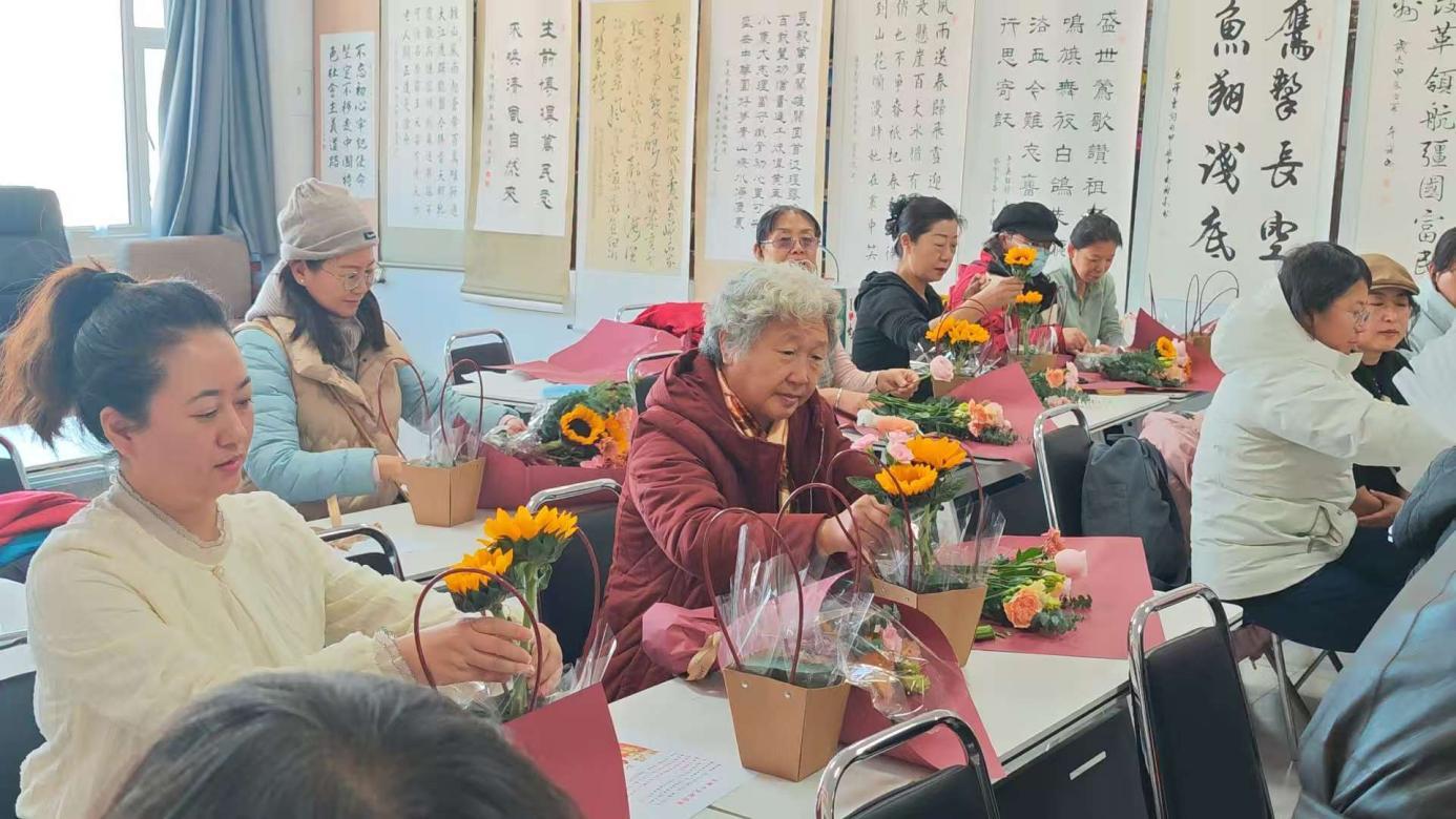 活动开始前,工作人员精心挑选了玫瑰、康乃馨、向日葵等多种新鲜花材,还有剪刀、花泥、花篮等实用工具,确保大家能顺利完成创作。活动当天,工作人员从花材的选择、色彩的搭配、造型的设计等方面,用通俗易懂的语言进行了详细讲解,并现场演示了如何修剪花材、固定花泥和搭配花束。居民们听得认真,看得仔细,遇到不懂的地方及时提问,工作人员都耐心地一一解答。
