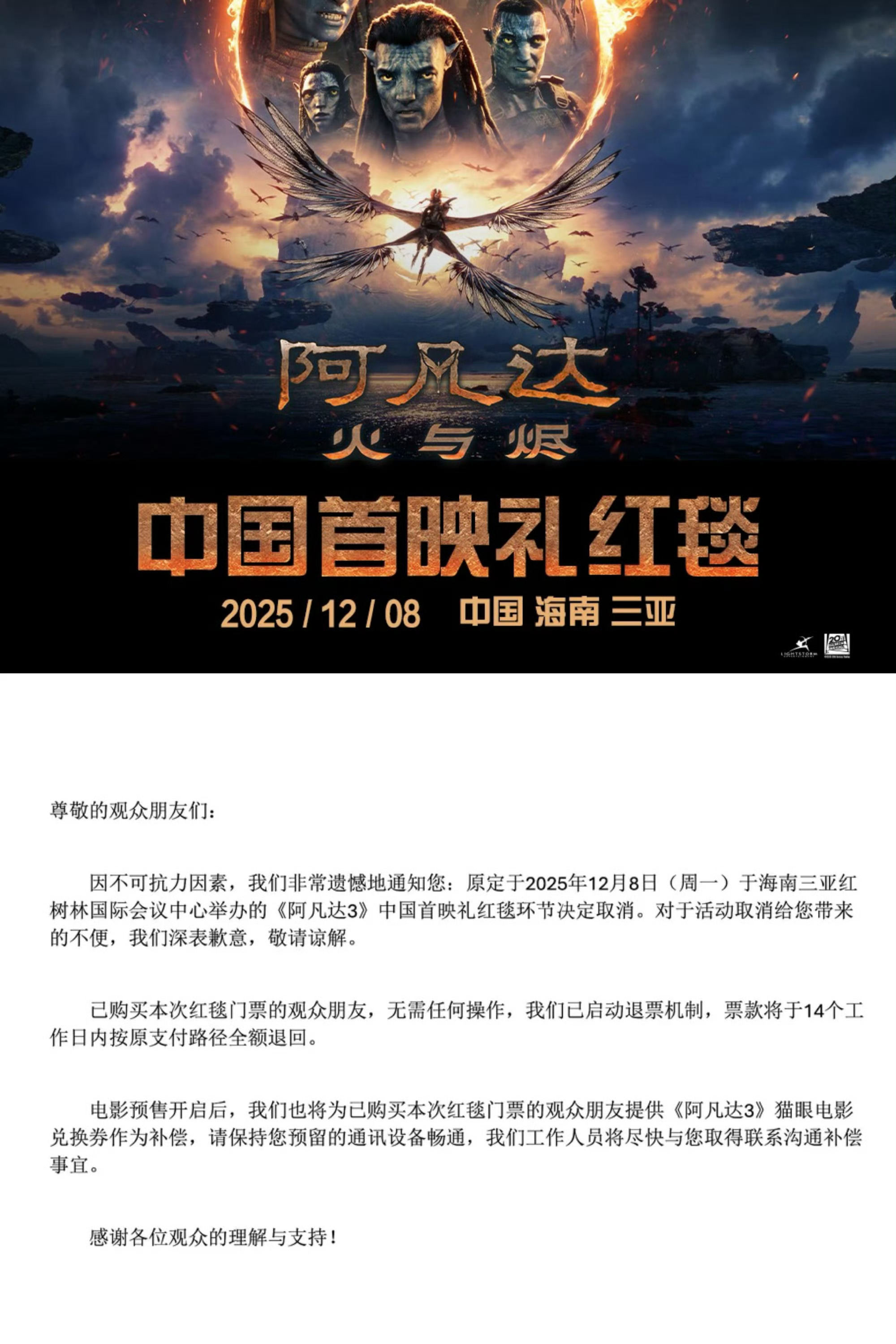 电影《阿凡达3:火与烬》将于12月19日上映,出品方迪士尼临时宣布取消12月8日海南三亚举办的中国首映礼中的红毯环节12月1日在美国洛杉矶举办了全球首映礼,根据照片来看,红毯环节布置了很多与火相关的装饰,所以疑似因为香港火灾事件而取消了中国首映礼的红毯环节已购买红毯门票的观众将会收到退款,还会收到补偿的一张电影票劵