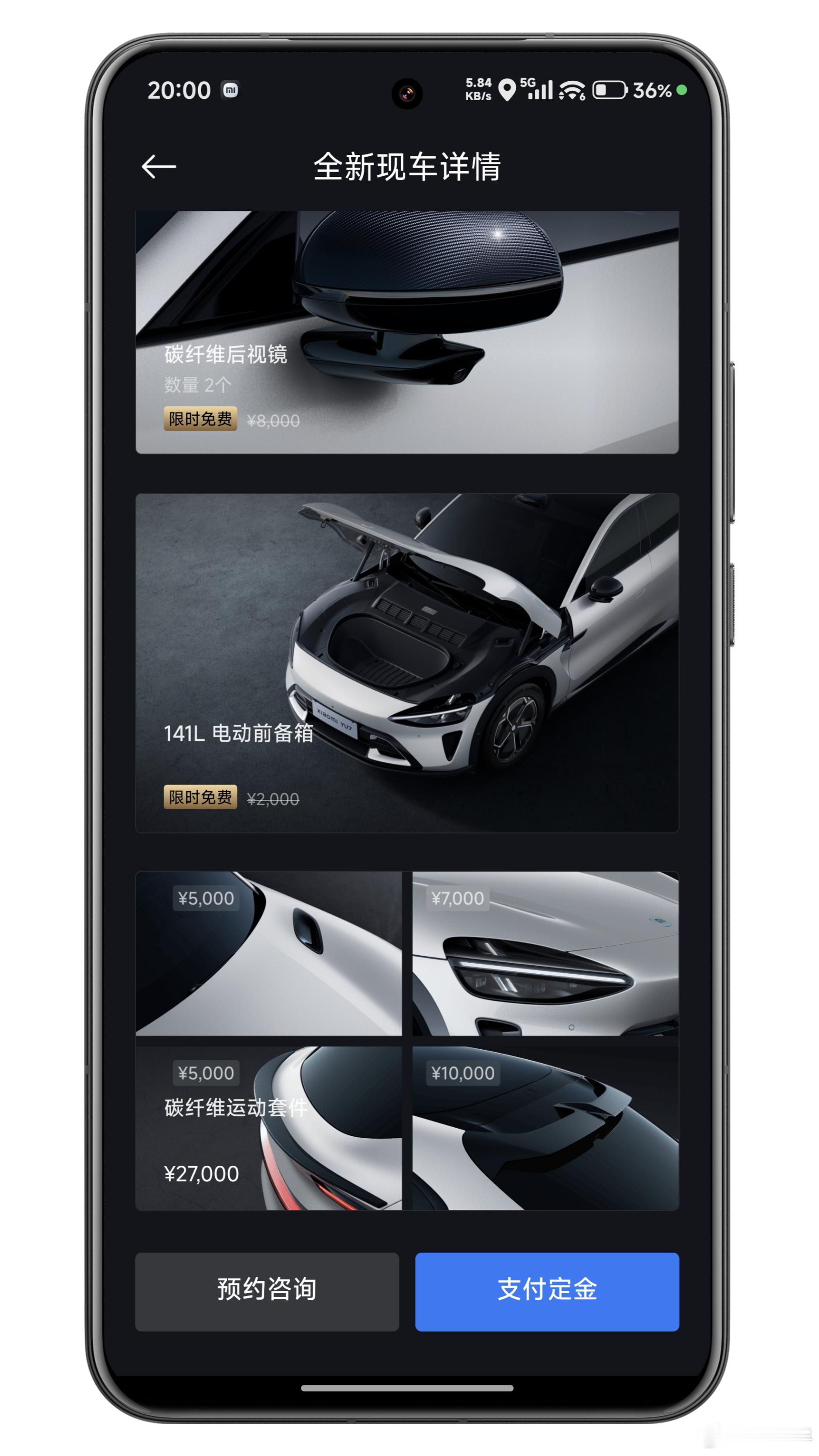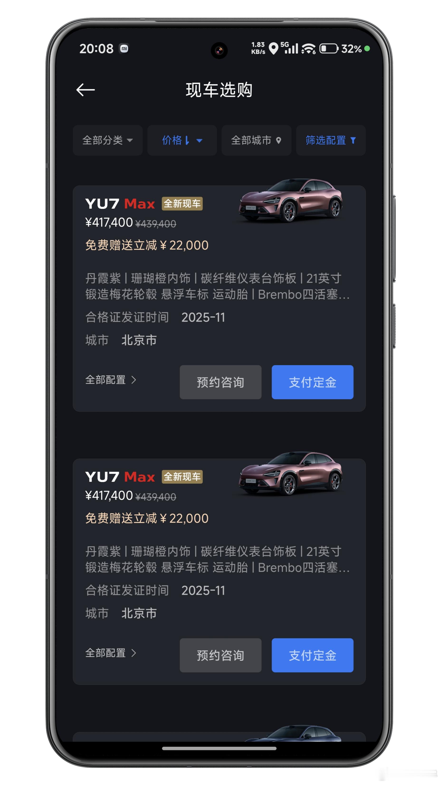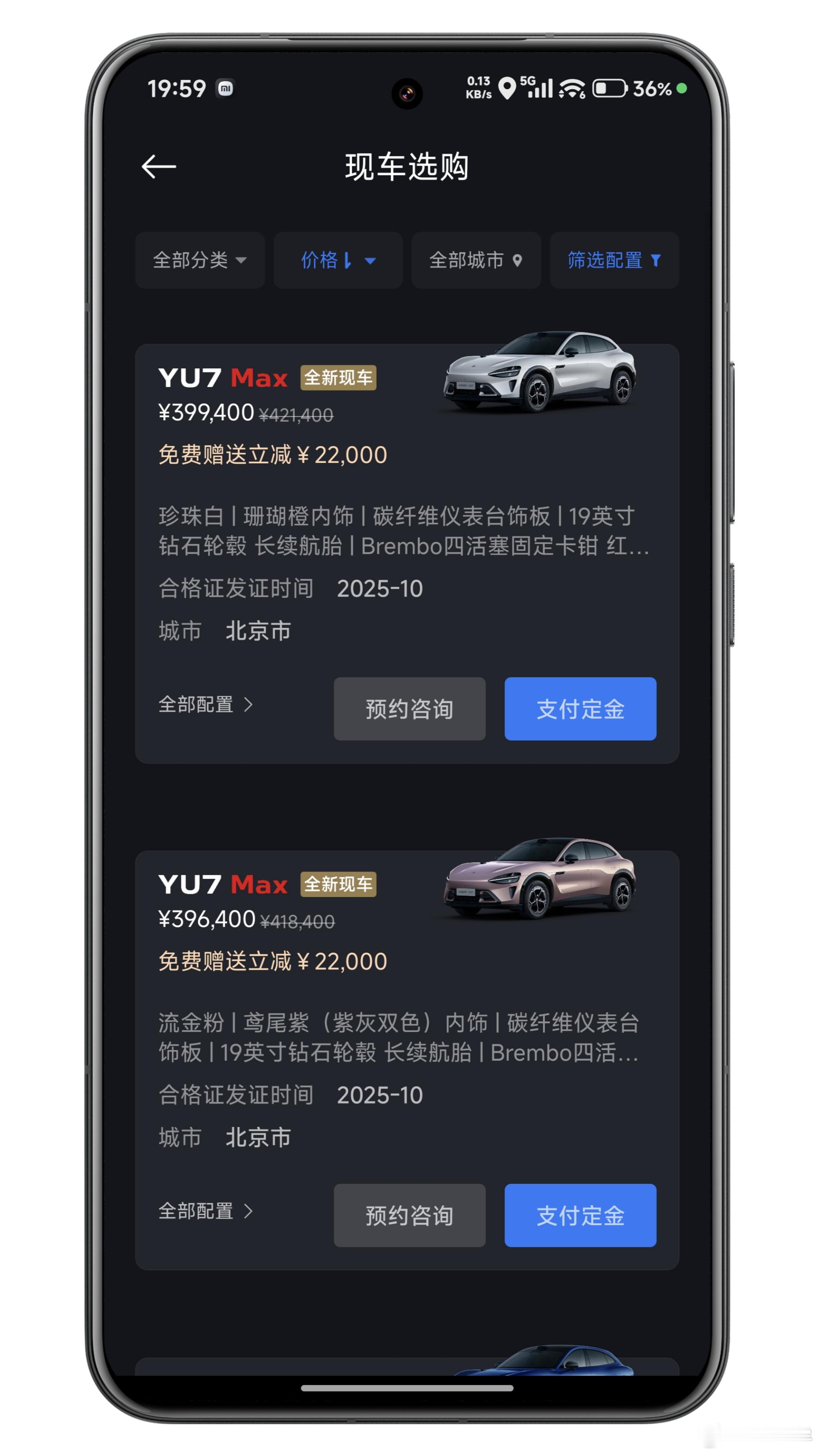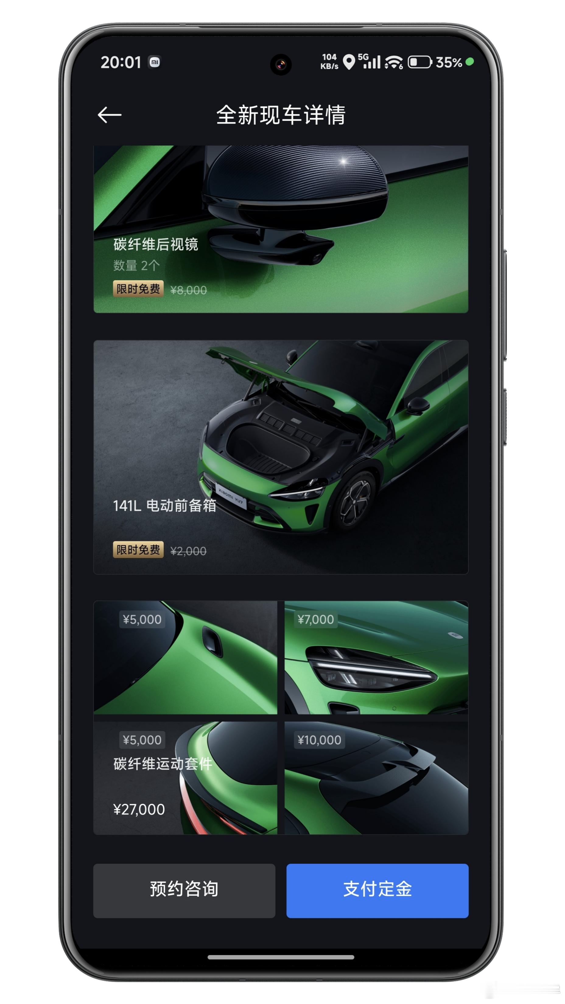其实看抢剩下的部分小米现车,配置确实很奇怪选到满配还加了冰箱的 32.7 万 SU7 Max(图1)和满配几乎能上高定版的 41.7 万 YU7 Max(图2)如果说上面这些可能真的是有人原本想要的车…那图3这种要标配 19" 钻石轮毂但加 ¥1500 选红色卡钳、还选配碳纤维套件的,正常人都没法理解了红色卡钳确实是帅,我的 YU7 Max 准现车也有,但标配 19" 低风阻轮毂几乎看不见卡钳啊……我只能怀疑是有人锁单了又后悔不想要车,然后趁限时改配的机会故意改成这样,达到报复小米的目的如果是这样,那小米以后真要谨慎开放改配了…