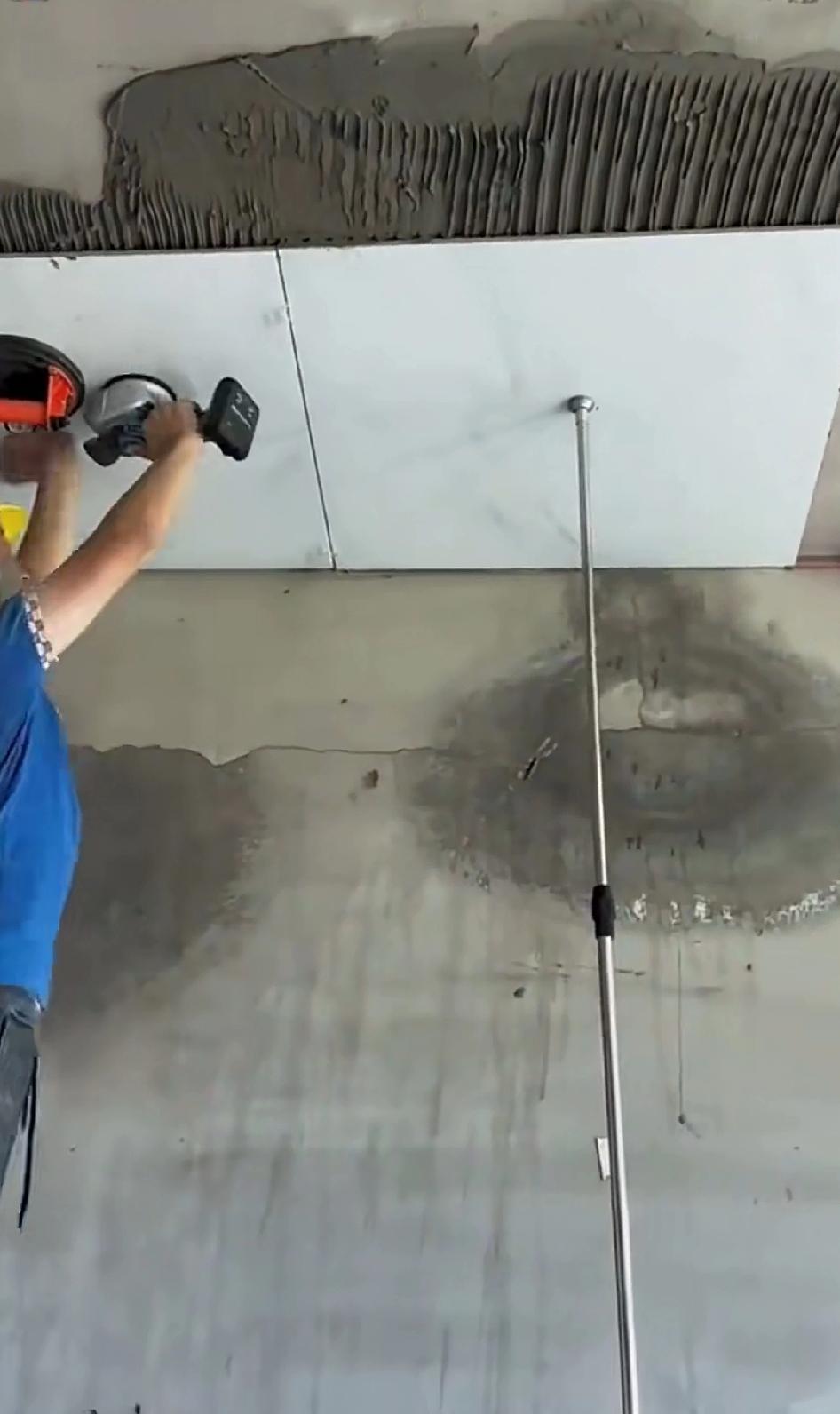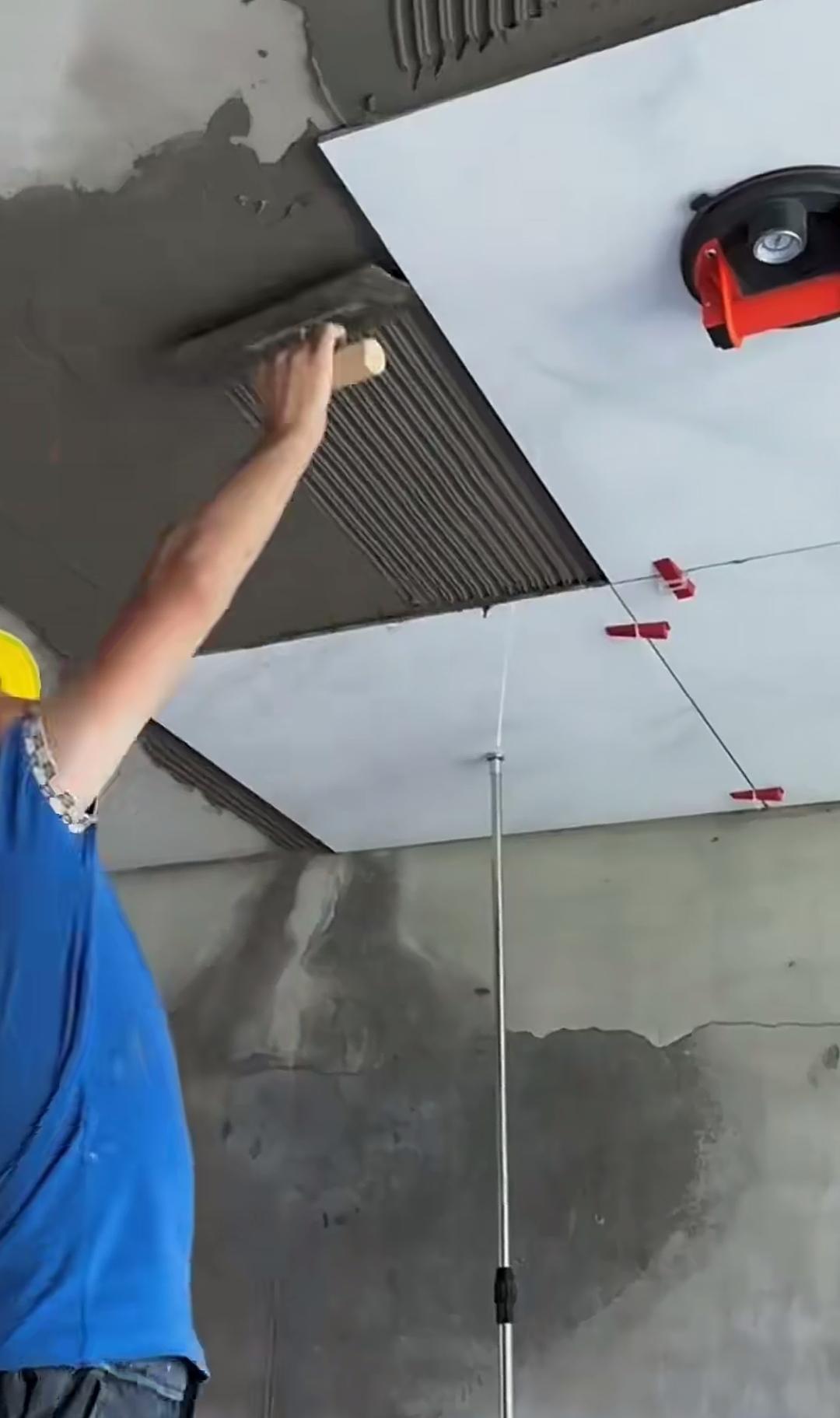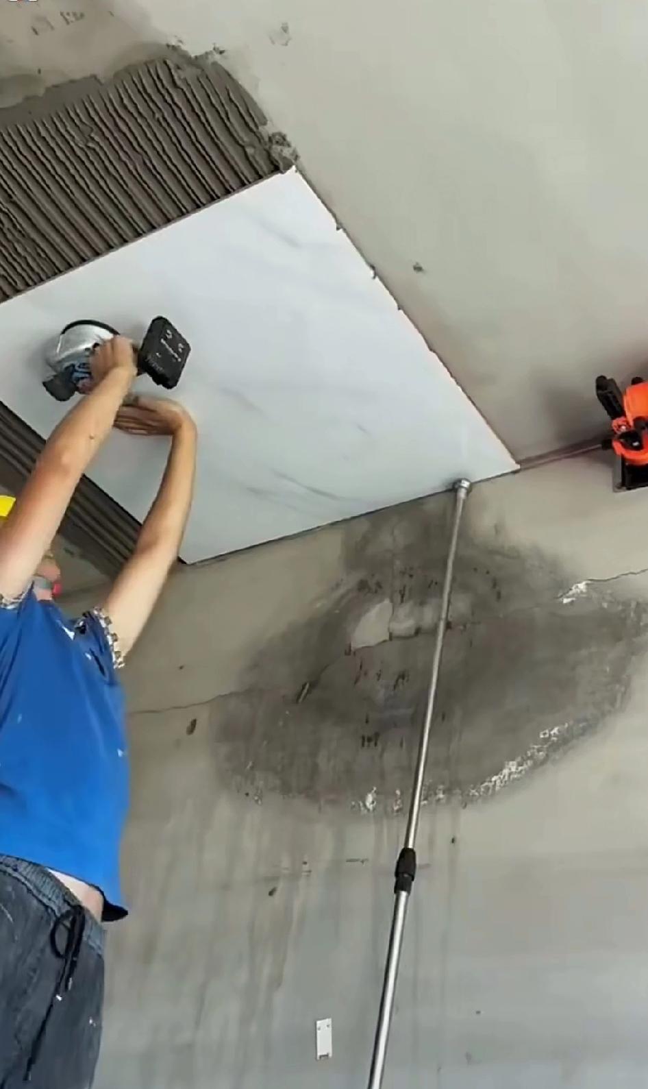 真是艺高胆子大!这位师傅竟把一块块80×80的瓷砖贴到房顶的倒板上。就这手艺,先