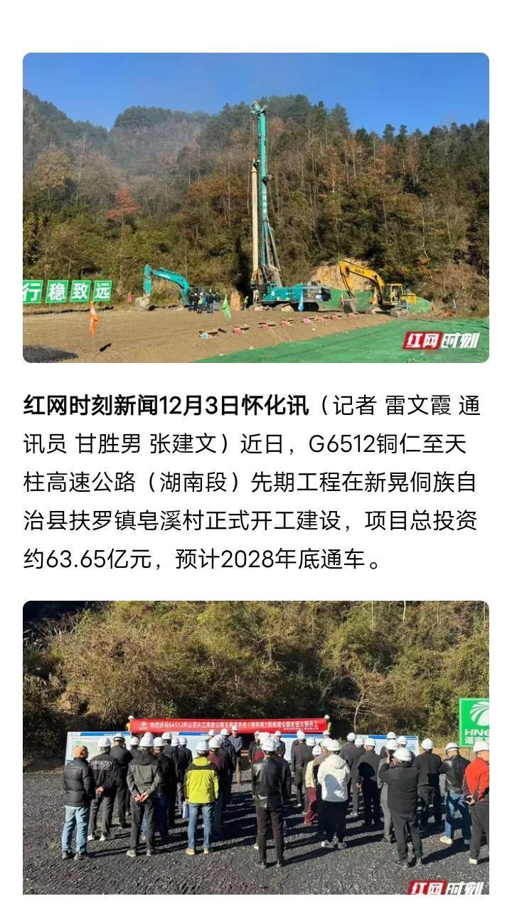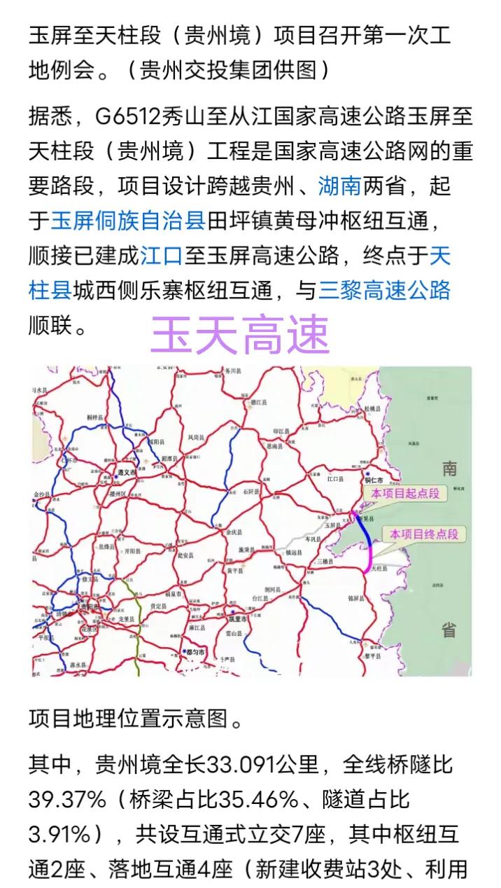 省际高速,G6512铜仁玉屏途经怀化新晃至黔东南天柱的玉天高速湖南和贵州段重点工程均已开工建设,预计2028年底建成通车,届时重庆秀山和铜仁等地开车来往天柱和锦屏还有黎平等地将更加便捷,比现在绕行G60沪昆高速三穗段至少要节省半小时,玉天高速全长约67公里,其中湖南段约34公里,起于玉屏田冲村附近接S19江玉高速与S15松从高速互联互通,止于天柱县西侧乐寨枢纽接三黎高速,沿途主要途经鱼市、扶罗、贡溪等乡镇,双向四车道(部分六车道),设计时速100公里每小时,目前全线重点桥隧工程均在热火朝天的建设中。