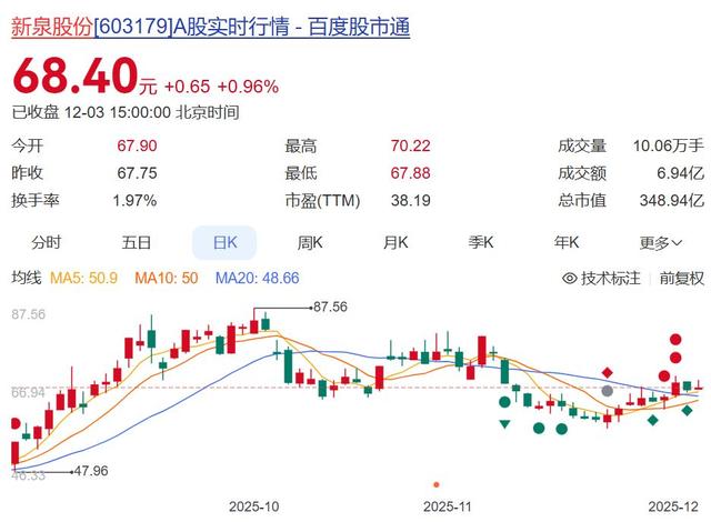 截至12月3日收盘,新泉股份股价报68.4元,年内涨超60%,总市值348.94亿元。