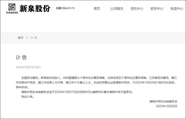 10月27日,新泉股份公告称,公司收到公司创始人、实际控制人之一唐敖齐的家属通知,唐敖齐于2025年10月26日逝世,享年80岁。
