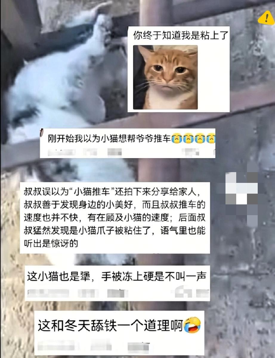 笑不活了! 辽宁阜新这只小猫也太会“演”了,搭着公公的推车以为是要帮忙,结果竟是爪子被冻在铁块上动不了,这美丽的误会也太东北了! 千万别觉得这事好笑就不当回事,东北冬天的寒冷对宠物来说藏着风险—— 小猫爪子碰水后粘在铁车上,本质是低温导致的冻伤隐患,严重时可能损伤爪垫组织呢。 看似可爱的意外,其实是给铲屎官提了醒。 冬季养宠真不是光给个暖窝就行,户外的冰雪、冷水都可能让宠物受伤,出门给小猫穿个防滑鞋、回家及时擦干爪垫,这些小细节就能避免危险。 你家宠物冬天出门会做哪些保暖防护?