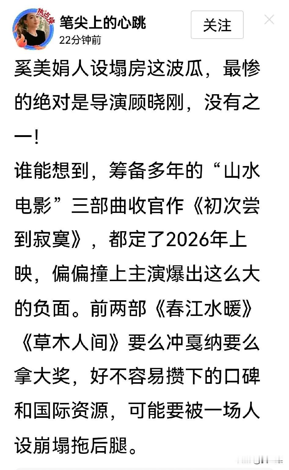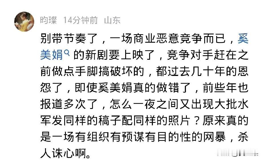 都是带节奏, 奚美娟这么优秀的老演员,竟然被翻出旧账, 2023年周野芒打得官司澄清的事实,现在突然又热闹起来,不觉得可疑吗? 就算40多年前做过错事,难道她不是一个好演员,不是一个好母亲吗? 她在事业上的成功是自己奋斗出来的, 在家庭上单独抚养孩子也是真实的。 为了维护孩子健康成长,从来没有占用公共资源去解释个人的私事,也是有错吗? 40多年前的旧账, 在现在这么混乱的娱乐圈,又被翻出来,是想毁一个演员,还是想毁一部戏?