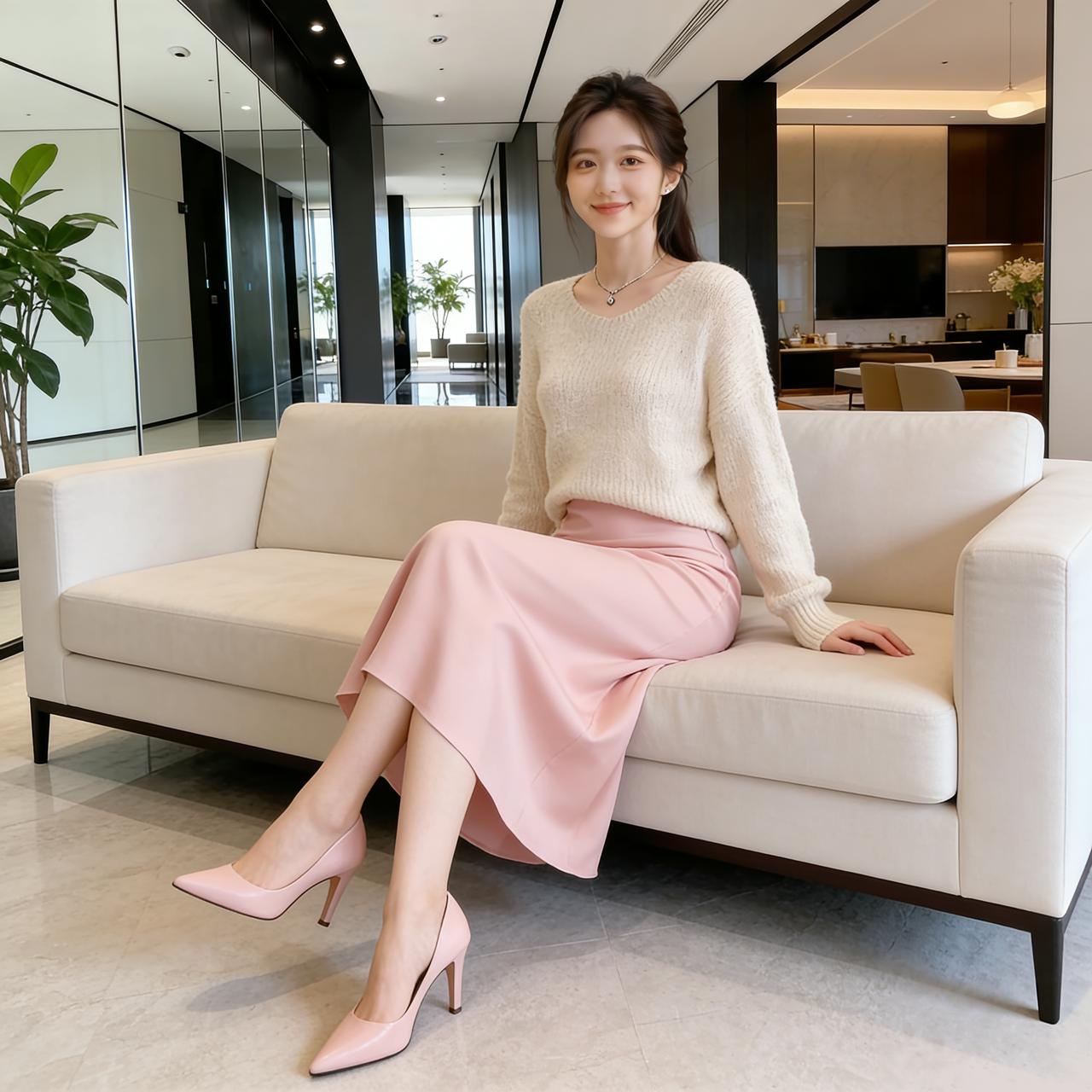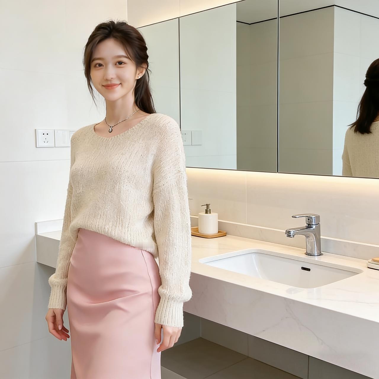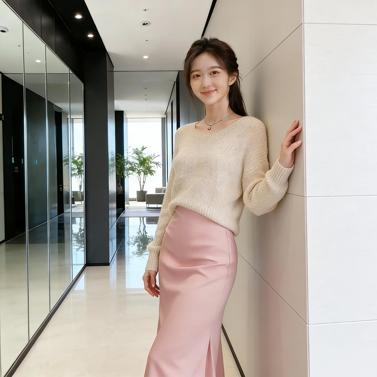 她这身穿搭属于温柔松弛的日常风~ 浅杏色针织毛衣,宽松的版型自带慵懒感,细腻的纹