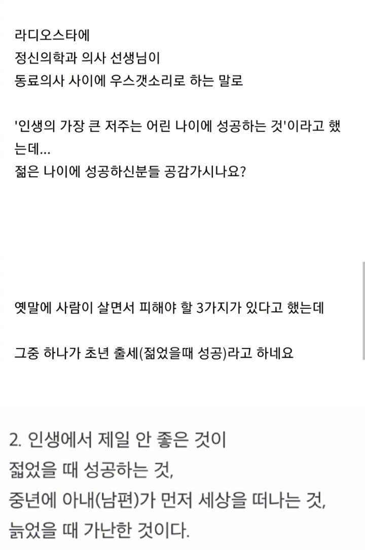 【Theqoo】在某档广播节目中,一位精神科医生用同事之间半开玩笑的口吻说过这样一句话:“人生最大的诅咒之一,就是在太年轻的时候就成功。”大家认同这个观点吗?图2译:古语里也有一句话:人生有三件事最好要避免,其中之一便是 “少年得志(过早成功)”。有人还总结过:人生中最不好的三件事分别是:年轻时就成功;中年时失去伴侣(妻子/丈夫);老来贫困。
