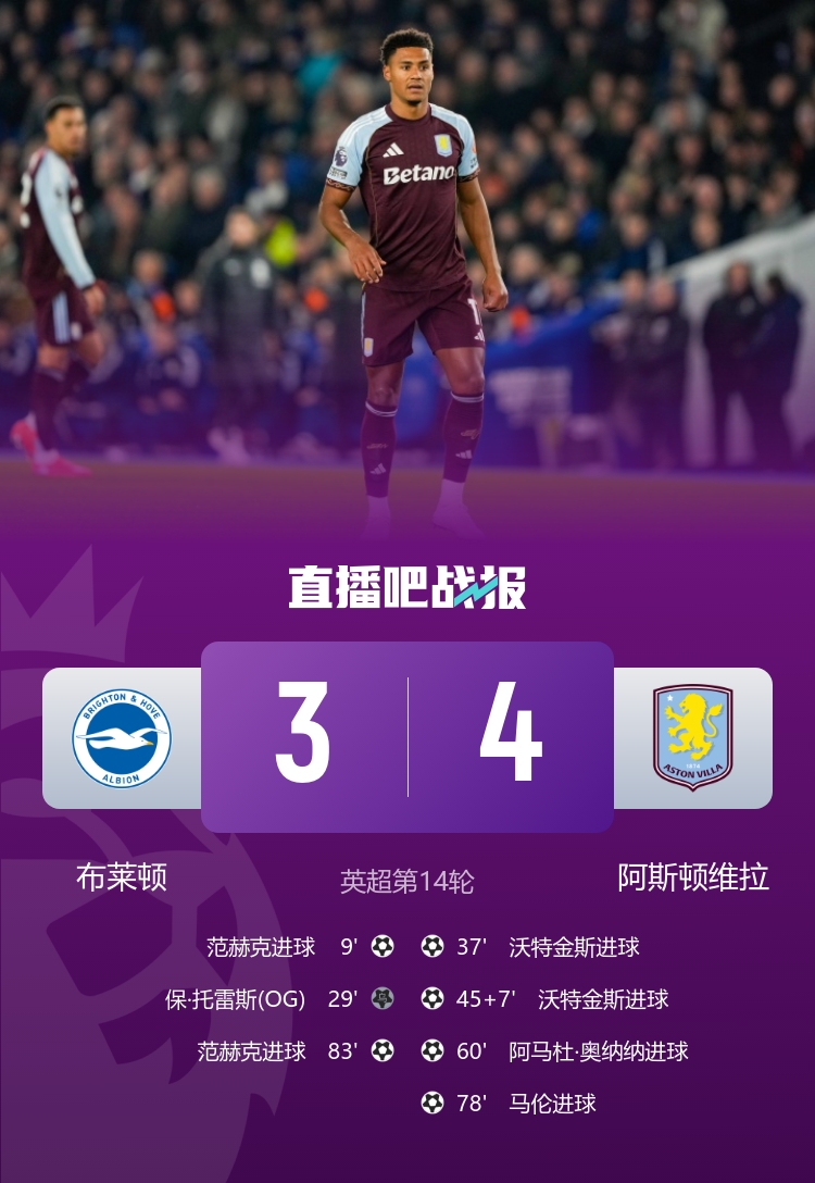 直播吧12月4日讯北京时间12月4日凌晨3时30分,2025-26赛季英超第14轮在美国运通社区球场展开角逐,布莱顿主场迎战阿斯顿维拉。上半场范赫克先拔头筹,辛谢尔伍德替补造乌龙,沃特金斯双响扳平,下半场阿马杜-奥纳纳反超比分,马伦替补破门,范赫克头顶脚踢梅开二度。最终阿斯顿维拉客场4-3逆转布莱顿,维拉取得各赛事6连胜+积27分暂升英超第3名,布莱顿遭遇本赛季主场首败。