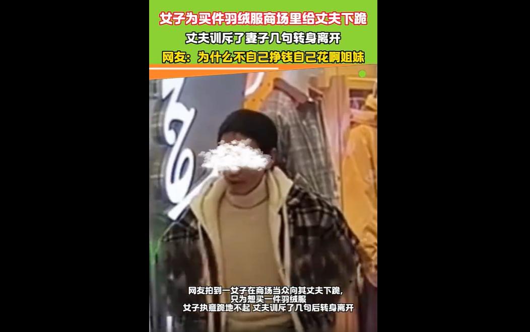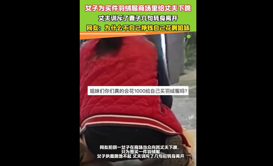 2025 年 12 月 2 日,湖北孝感某商场,一女子为买 299 元羽绒服向丈夫下跪哀求,丈夫拒绝训斥后离开。 女子穿旧衣、丈夫衣着体面,引发热议。 网友有人疑摆拍(299 元易买、行为反常),指摆拍或违法;有人猜女子是全职主妇,经济依附没话语权,还讨论家务无酬致地位低,强调经济自主权 = 婚姻平等权,无论真假都揭示危险关系模式。 这事不管是真的还是摆拍,都挺让人不舒服的。 要是真的,为件 299 元的羽绒服下跪,也太没尊严了,说到底还是经济不独立闹的,伸手要钱哪有话语权? 要是摆拍,为了博流量编这事儿,消耗大家善意,还可能违法,太不地道。 网友说 “经济自主权 = 婚姻平等权” 特别对,不管男女,手里有钱腰杆才硬。 就算是全职主妇,家务劳动也该被认可,不能因为没挣钱就没地位。健康的婚姻哪用得着下跪要东西? 互相尊重、双向奔赴才对。希望不管真假,都能让更多人明白,尊严比啥都重要。