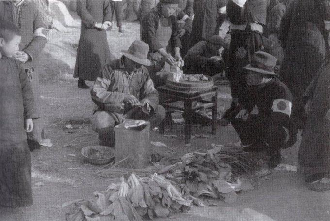 这张老照片中,地面上堆着几捆白菜、萝卜等蔬菜。两名中国男子蹲在地上,一人正在切菜,一人拿着小碗,似乎在吃东西或喝汤。右边蹲着一个佩戴“日章旗”臂章的汉奸,也拿着碗,低头在吃。整体气氛看似平静,甚至有种“市井生活”的感觉。 日方常见标注:「野菜を呑気に売る中国人さん」,中文意思:中国人悠闲地卖蔬菜呢。这张照片被日本人拿来证明“南京沦陷后老百姓生活马上恢复正常、日军并未扰民”。 这张照片的真实拍摄时间是1938年4月以后,地点大概率在北平或天津郊区,而不是南京。1938年春夏,日军在华北已经基本完成占领,建立了维持会、治安军,表面秩序确实有所恢复。而南京在1937年12月到1938年2月之间,城内三分之一建筑被烧毁,数十万具尸体来不及掩埋,活人根本不敢上街卖菜——因为一出安全区就会被日军当场枪杀或强奸。 蹲在地上吃饭、戴日章旗臂章的那个人,多半是汉奸“宣抚班”成员,把一张1938年华北的“维持会治安下的菜市场照片”拿来说明1937年12月南京“老百姓悠闲卖菜”,就相当于拿1944年奥斯维辛旁边波兰农民的集市照片来证明“犹太人根本没被杀”一样荒谬。