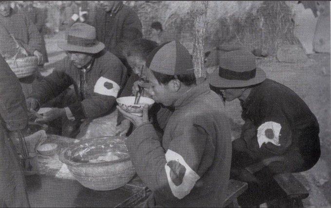 1937年12月15日南京,四五个穿黑色棉袄、左臂佩戴白底红日章臂章的人正蹲在路边吃饺子(或面条)。 他们面前摆着一口大铁锅、一只陶盆,里面盛着食物,有人正用筷子往嘴里送。 日方常见标注:「こちらの写真は1937年12月15日 佐藤振寿カメラマン撮影(東京日日新聞)。南京大虐殺3日目に呑気に餃子を食べているのは驚きますね」 翻译:这是1937年12月15日东京日日新闻记者佐藤振寿拍摄并。南京大屠杀第三天还有人悠闲地吃饺子,真让人惊讶啊! 这些人被标注为“中国人”,照片里所有“吃饺子”的人左臂都清楚佩戴着白底红日的“日章旗臂章”,这是汉奸在占领区必须佩戴的标识,普通中国百姓绝不可能佩戴这种臂章!用汉奸悠闲吃饺子说明,用来否定南京大屠杀。